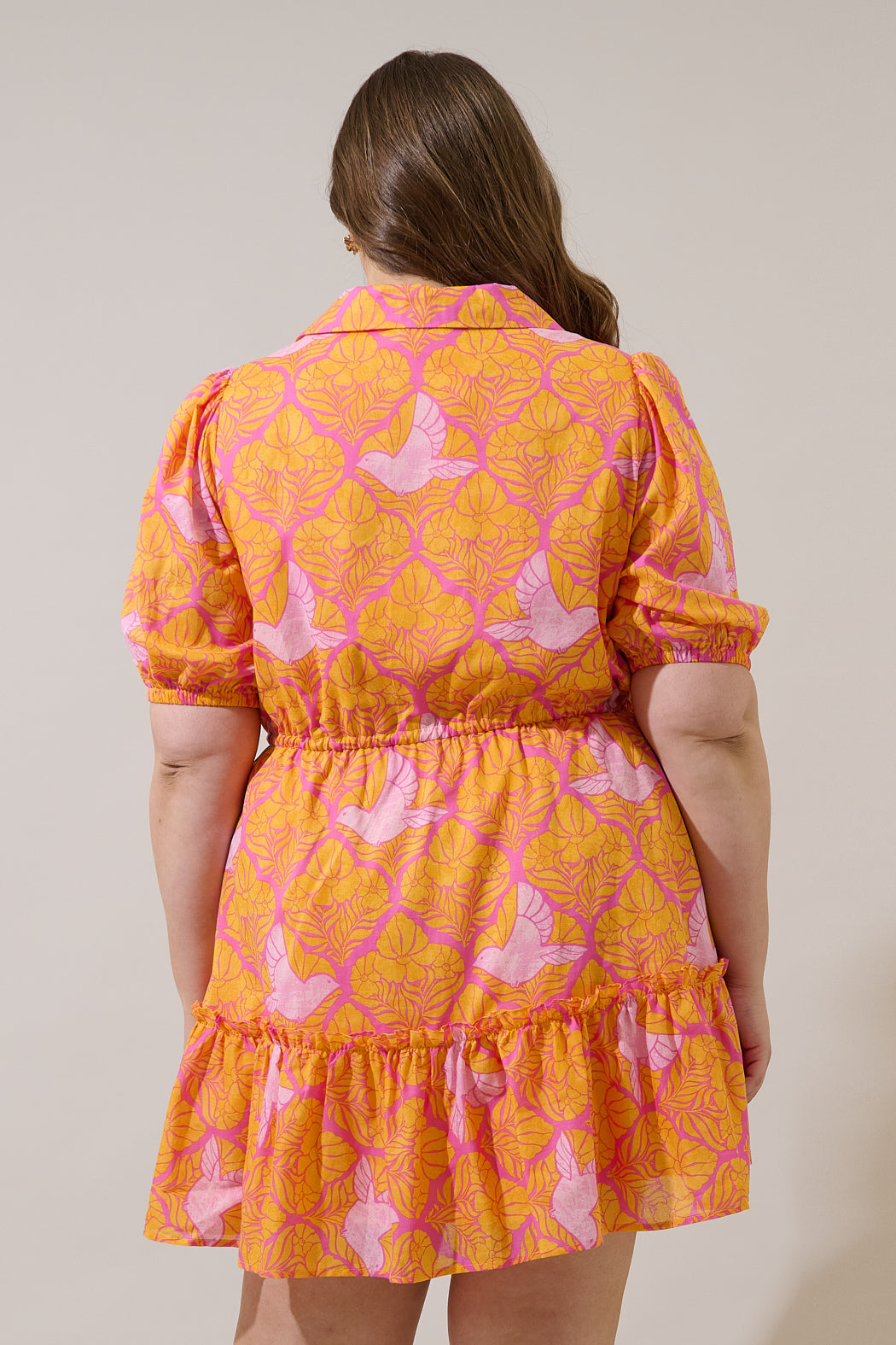 Feel the magic of spring all year round in this lively dress, where cheerful flowers and fluttering birds meet. Lightweight cotton fabric that has button down style with fitted bodice, and short half sleeves with elastic cuffs. A flirty ruffle hem finishes off the look and can be paired with heels.