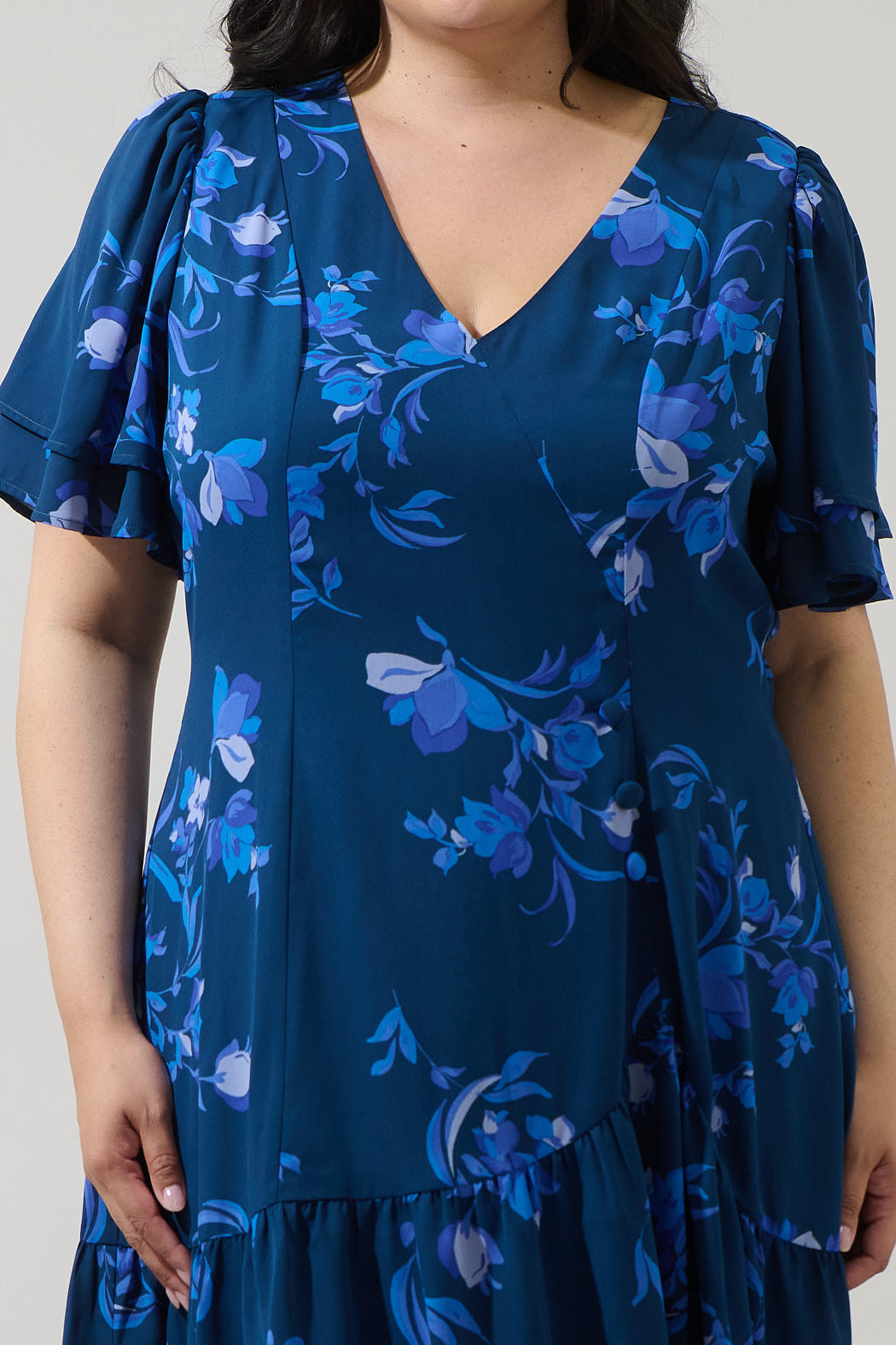 Creating a look that is as cute as you are is easy with this dress. A blue floral print decorates short flutter sleeves with a wrap front that has buttons along the edge. Wear it with strappy heels and gold accessories for a completed look.