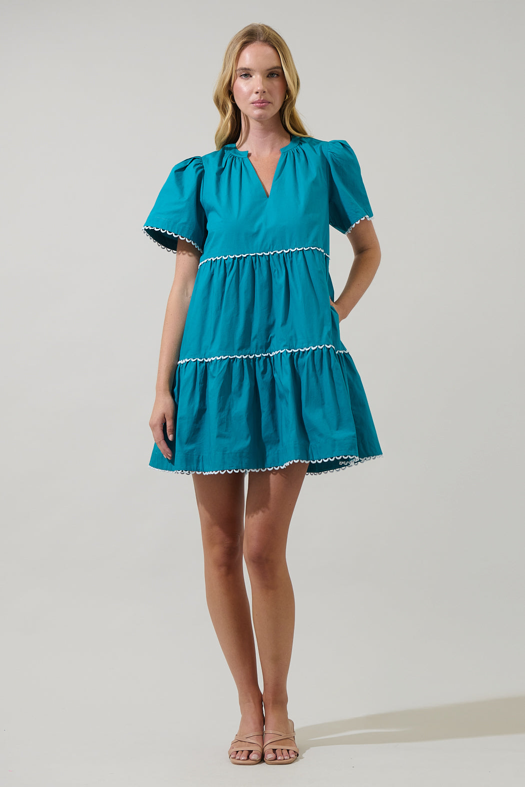 Step into playful elegance this season with a dress that captures effortless charm. This tiered mini dress features short sleeves, a split neckline, and scallop trim on the sleeves, hemming, and layers for a charming finish. Style it with strappy heels and a clutch for a night out or white sneakers and a crossbody bag for a playful daytime look.