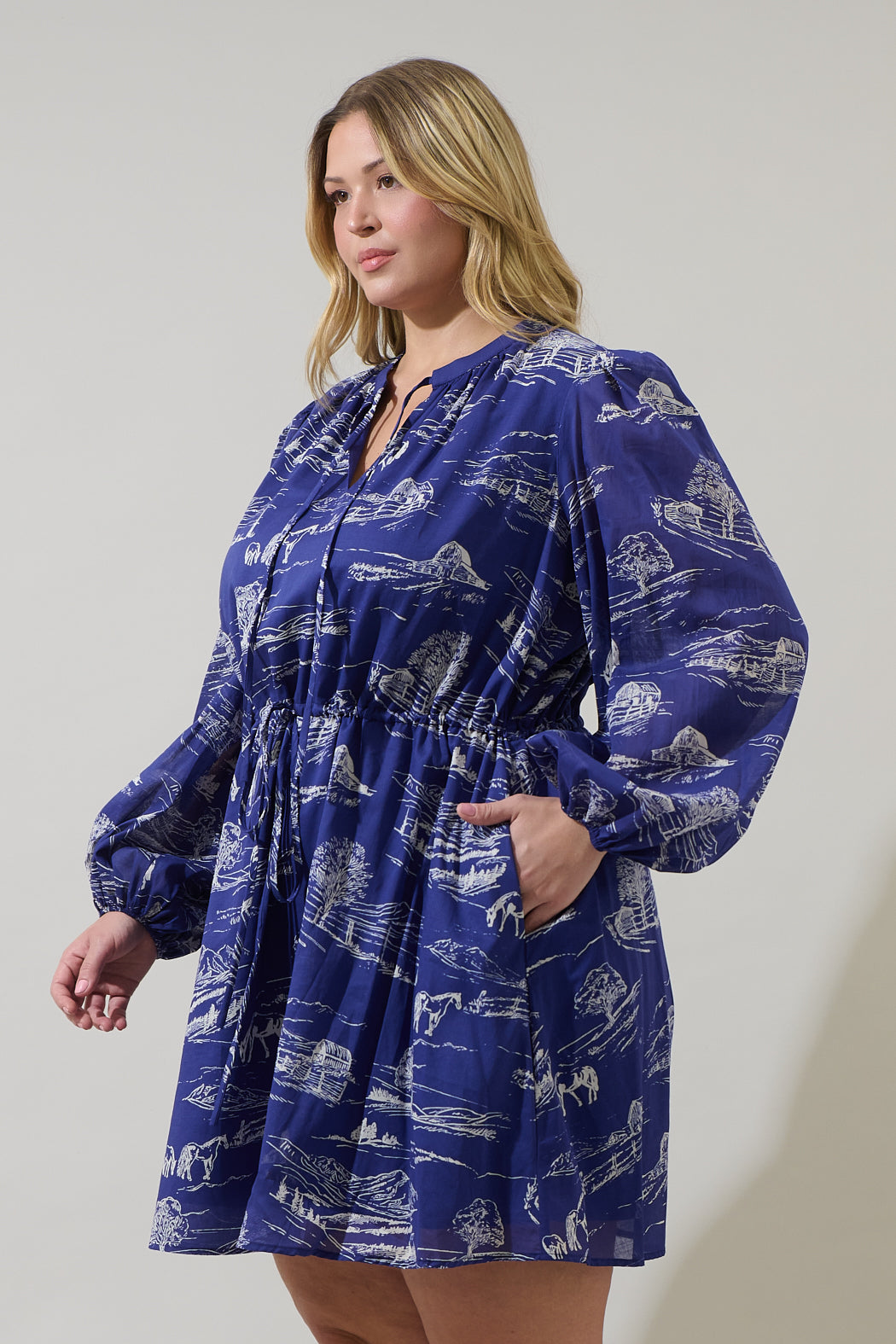 Step into timeless charm with a dress that captures attention and elevates your style. Featuring a rustic countryside toile print in classic white on navy, it includes a neck tie keyhole front, drawstring waist, long sleeves, and a flattering mini length for a vintage yet modern look. Pair it with ankle boots and a crossbody bag for an effortlessly chic finish.