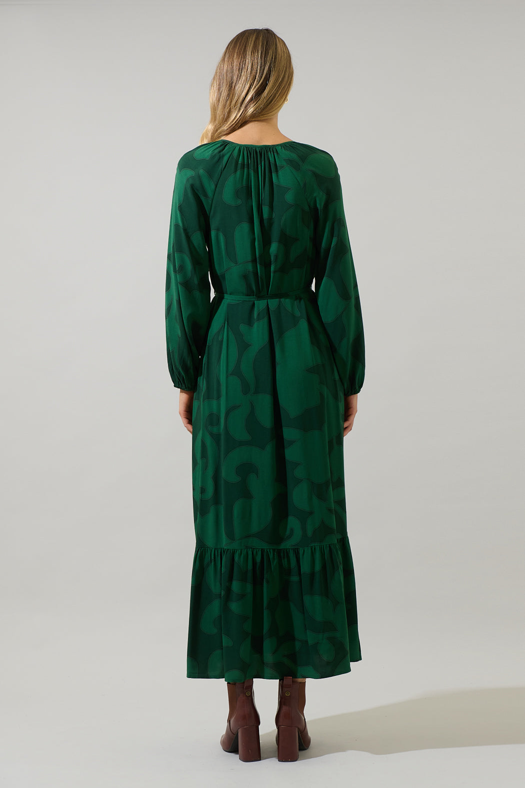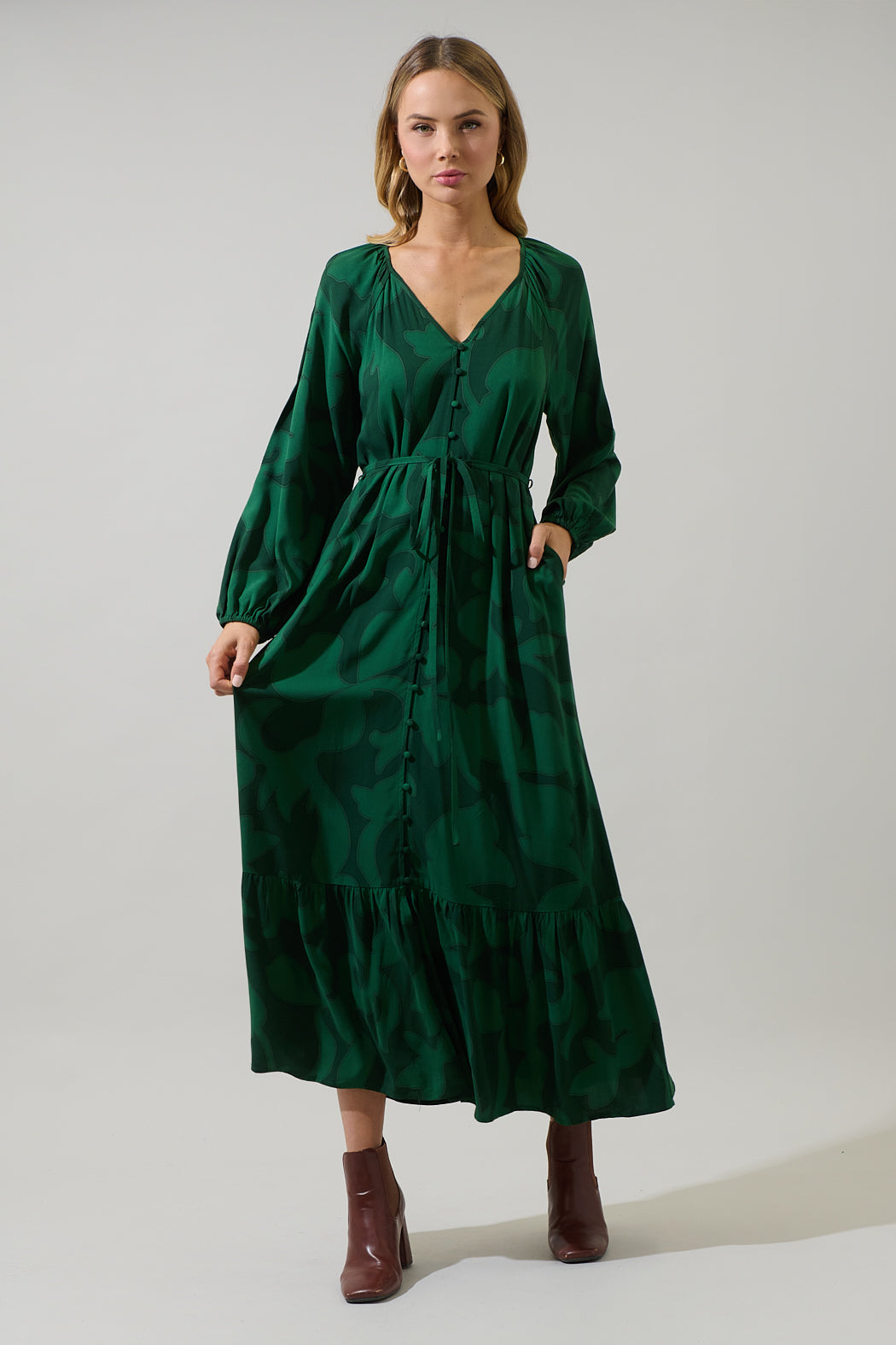 Step out in style with the ultimate Benti Abstract Larrie Button Down Maxi Dress. A green on green print decorates long balloon sleeves, split neck that leads to button down front, and a ruffle maxi hem. Adjust the belt on the waist and throw on your boots or heels for a complete look.