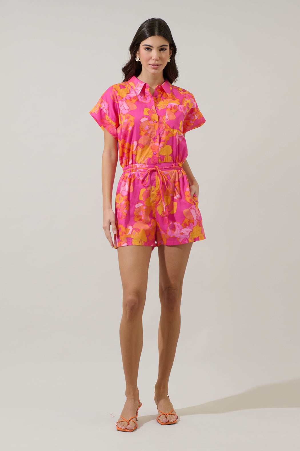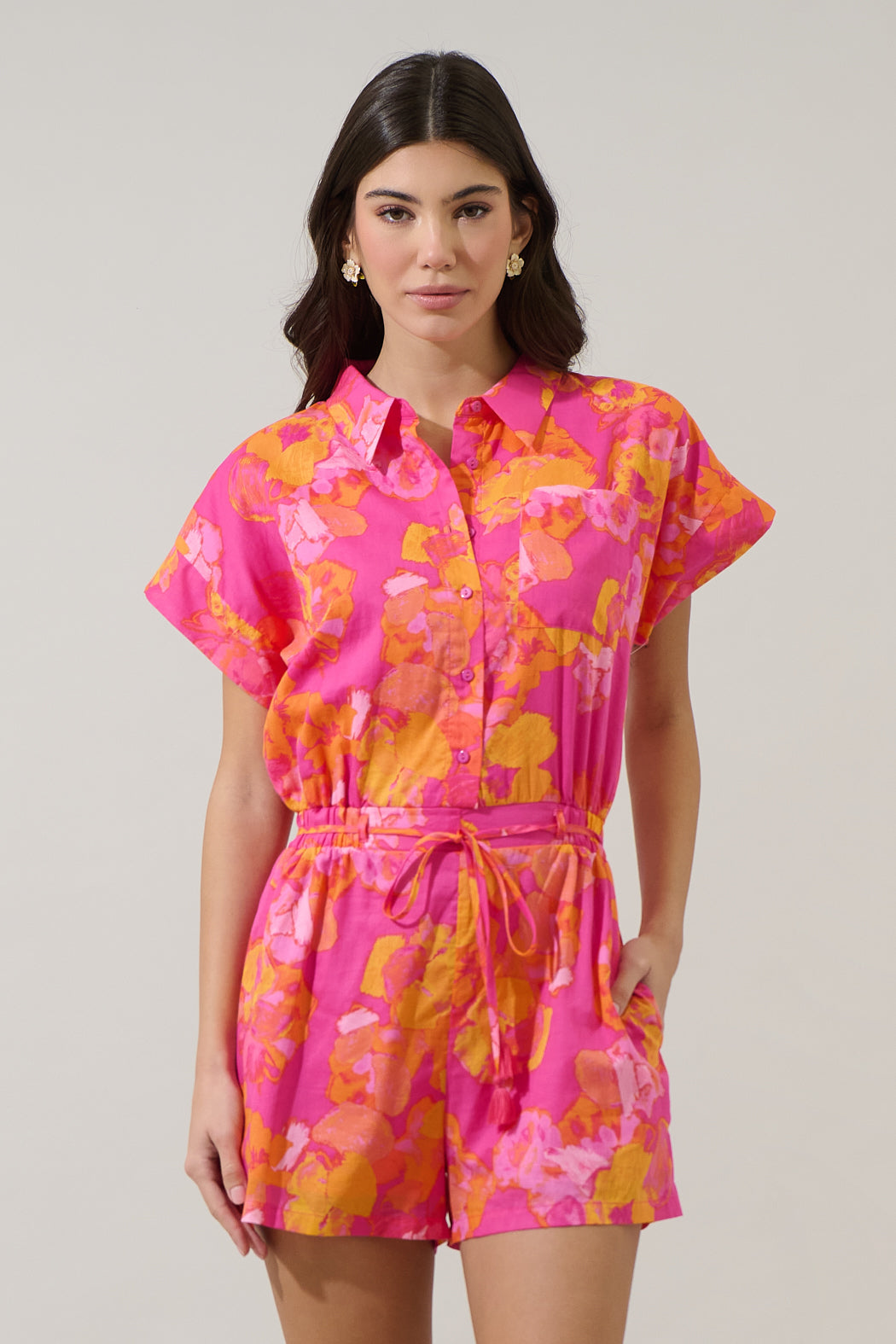 We're excited about any day where we can rock the Elaris Floral Mavy Button Up Romper. A bright pink and orange floral print decorate short sleeves with a collared neck and a button up front. The waist has an adjustable belt. Pair it with sunnies and heels.