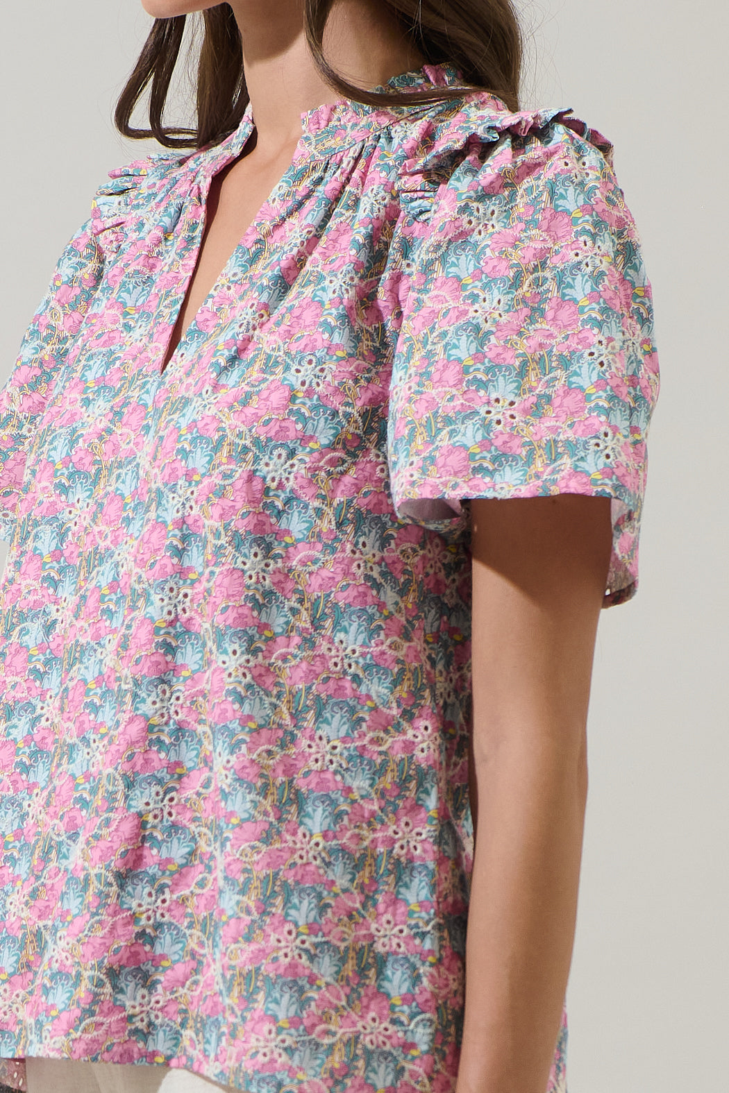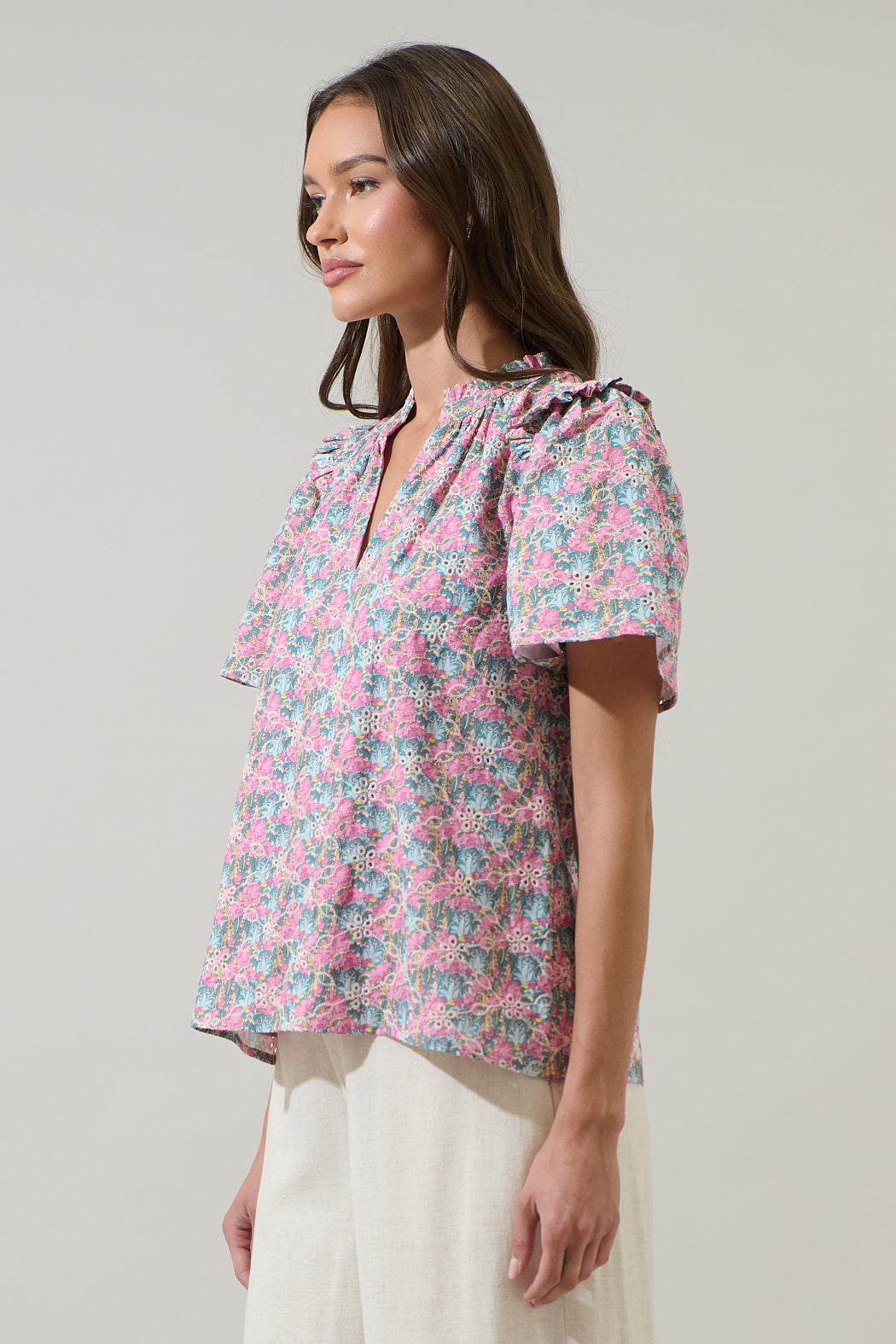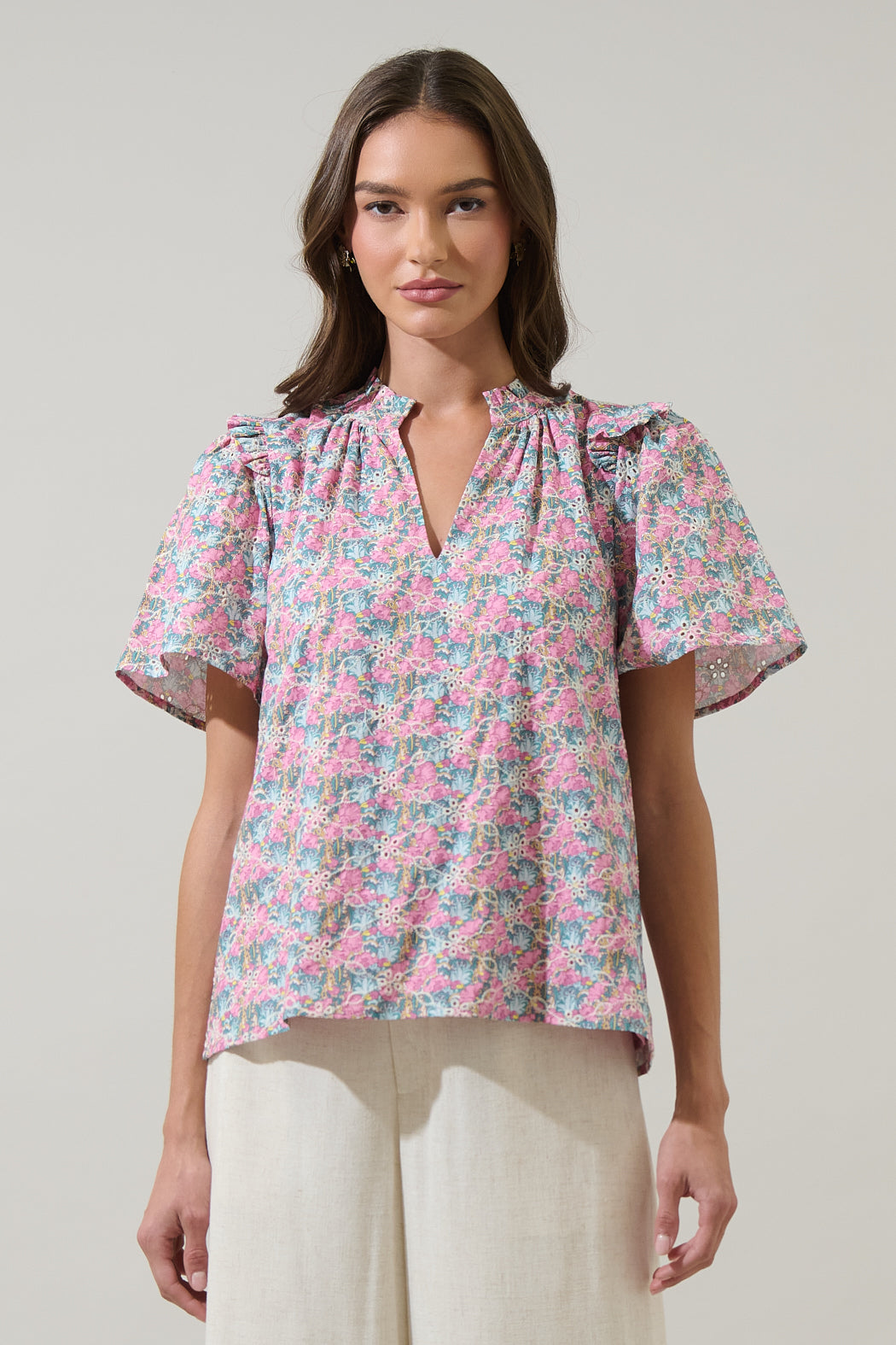 The Gemalee Eyelet Mei Split Neck Top is a timeless addition to any wardrobe. It features short sleeves with small pleats at the shoulders. The neck has ruffles around that lead to a split neckline. Perfect to wear with wide leg pants and pink heels.