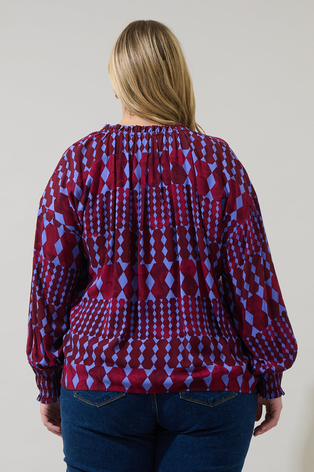 Turn casual days into fashion moments with ease. This top features a diamond geometric pattern, ruffle neck trim, self tie tassel strings that can be left open for a split neckline or tied to create a front keyhole, and long sleeves with smocked cuffs. Pair it with skinny jeans, heeled ankle boots, and a structured crossbody bag for an effortlessly chic look.