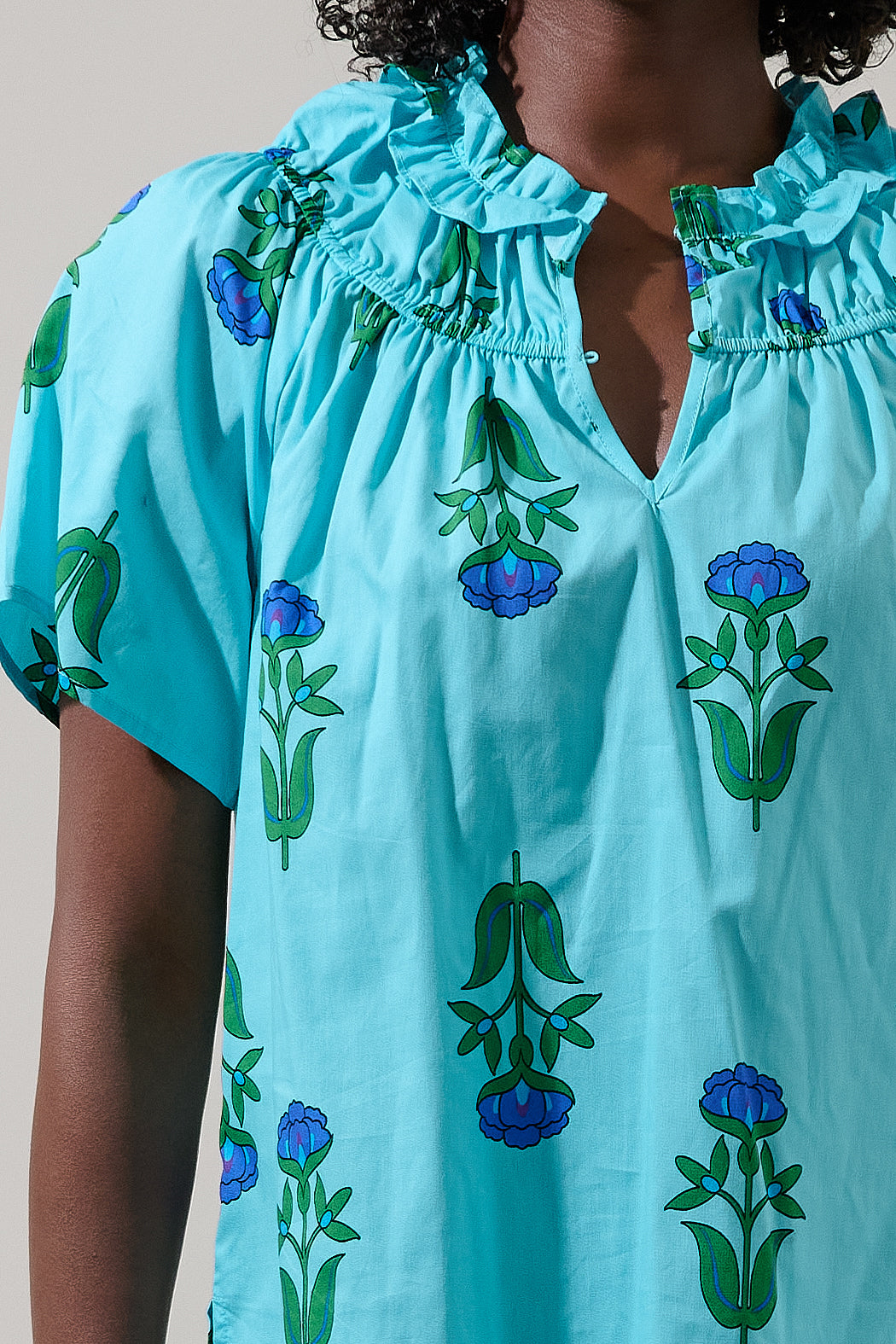 Show up and show off in this darling top. This short sleeve top has a split neck, relaxed fit, with a ruffle detail to give you a chic look. Throw on some trousers and heels for dressed up look or keep it casual with sneakers and jeans.