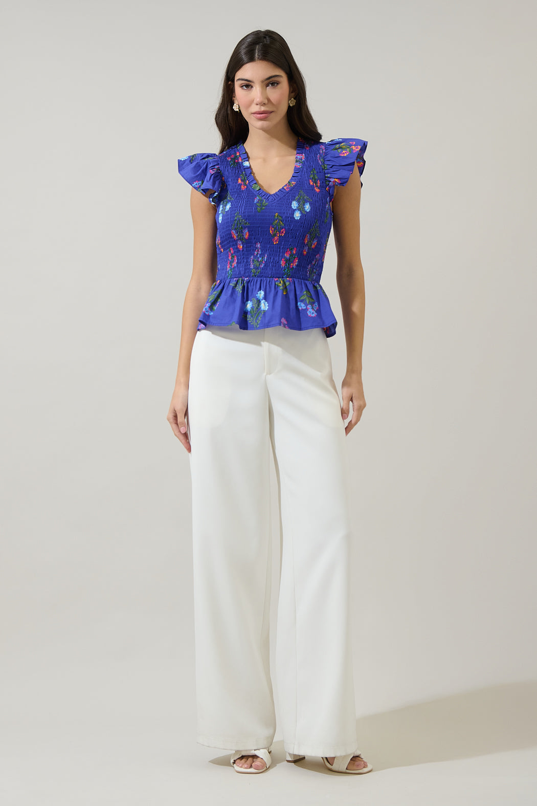 Elevate your everyday style with the stunning Clemen Floral Brish Smocked Ruffle Top. It features a stretchy smocked bodice that creates a defined waistline. A charming peplum hem flares out with a a flattering V-neck. Pair it with high waist denim jeans and heels.
