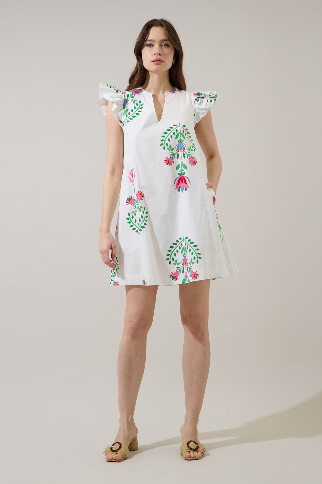 Serving looks, one bloom at a time. Ruffle cap sleeves frame a split neckline with a loose fit. It has functional pockets and ends at a mini length. Finish off the look with any shoes of your choice.