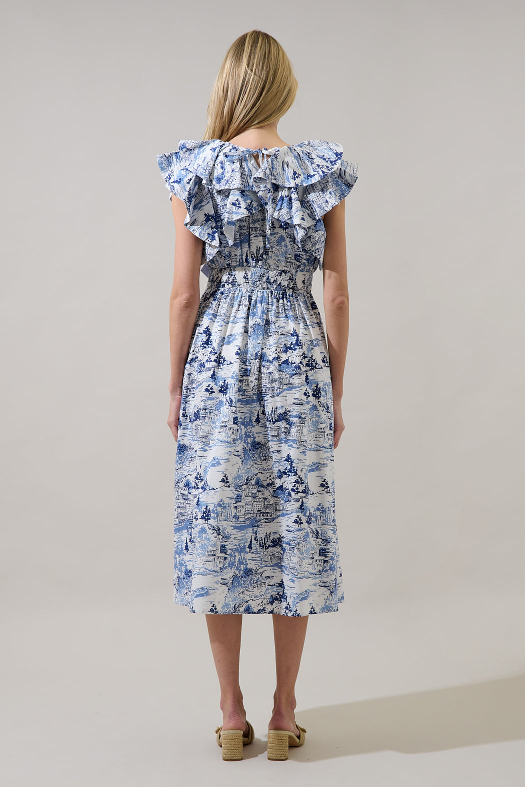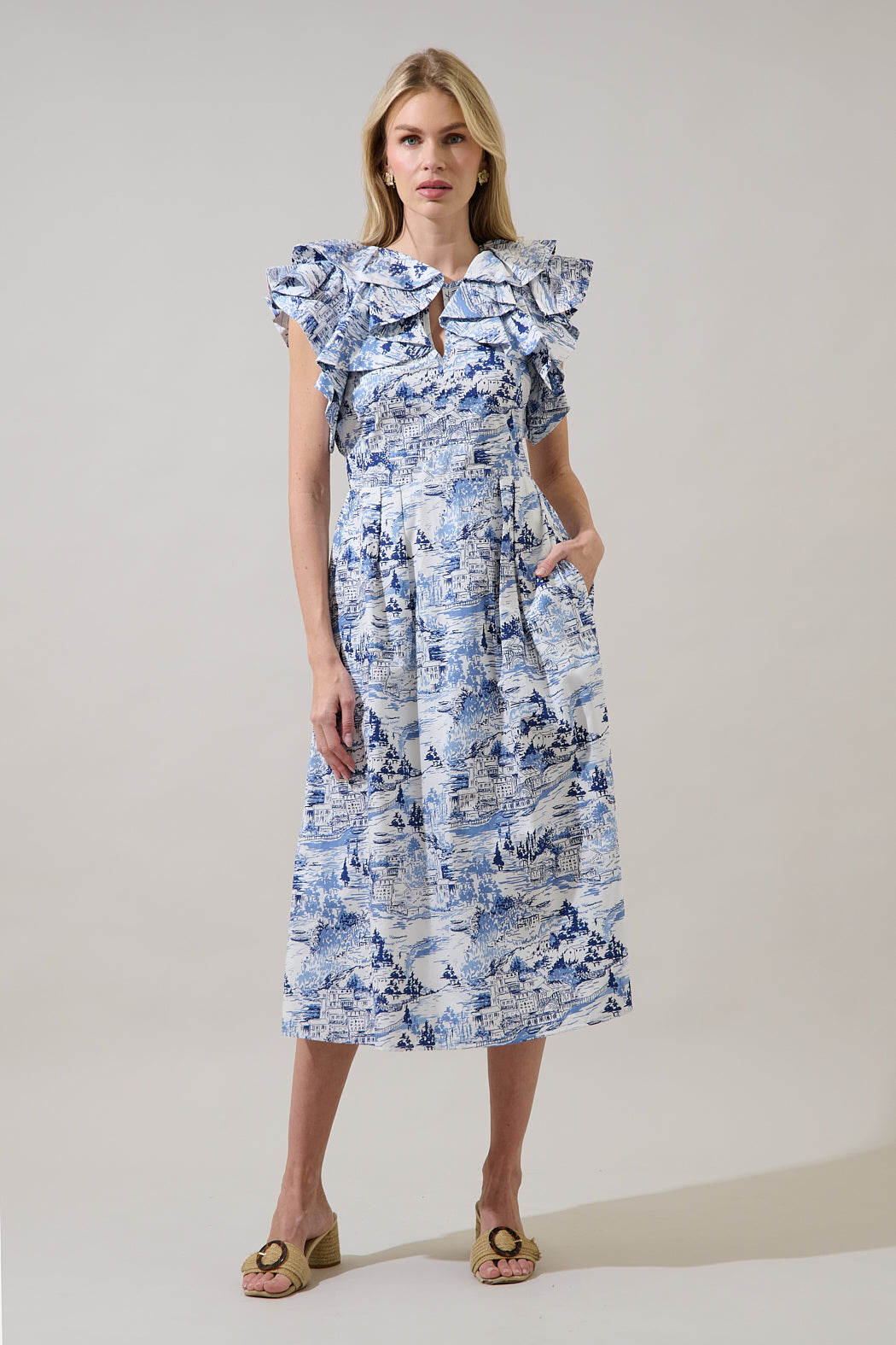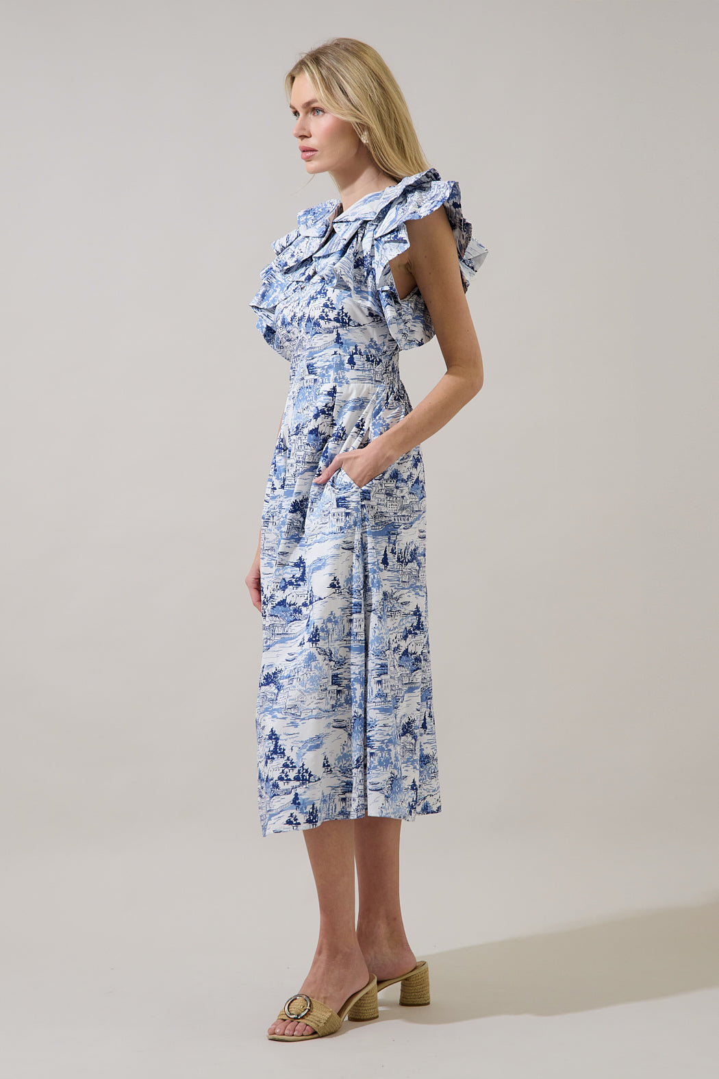 Paint the sky in this tonal blue pastoral printed midi. A refreshing take on the perfect vacay dress, it's embodied by a lightweight and airy cotton. Voluminous ruffle layered cap sleeves frame a split neckline. It maintains a relaxed fit with an A line midi skirt and pockets for convenience. Wear it with a floppy hat, woven accessories and mules.