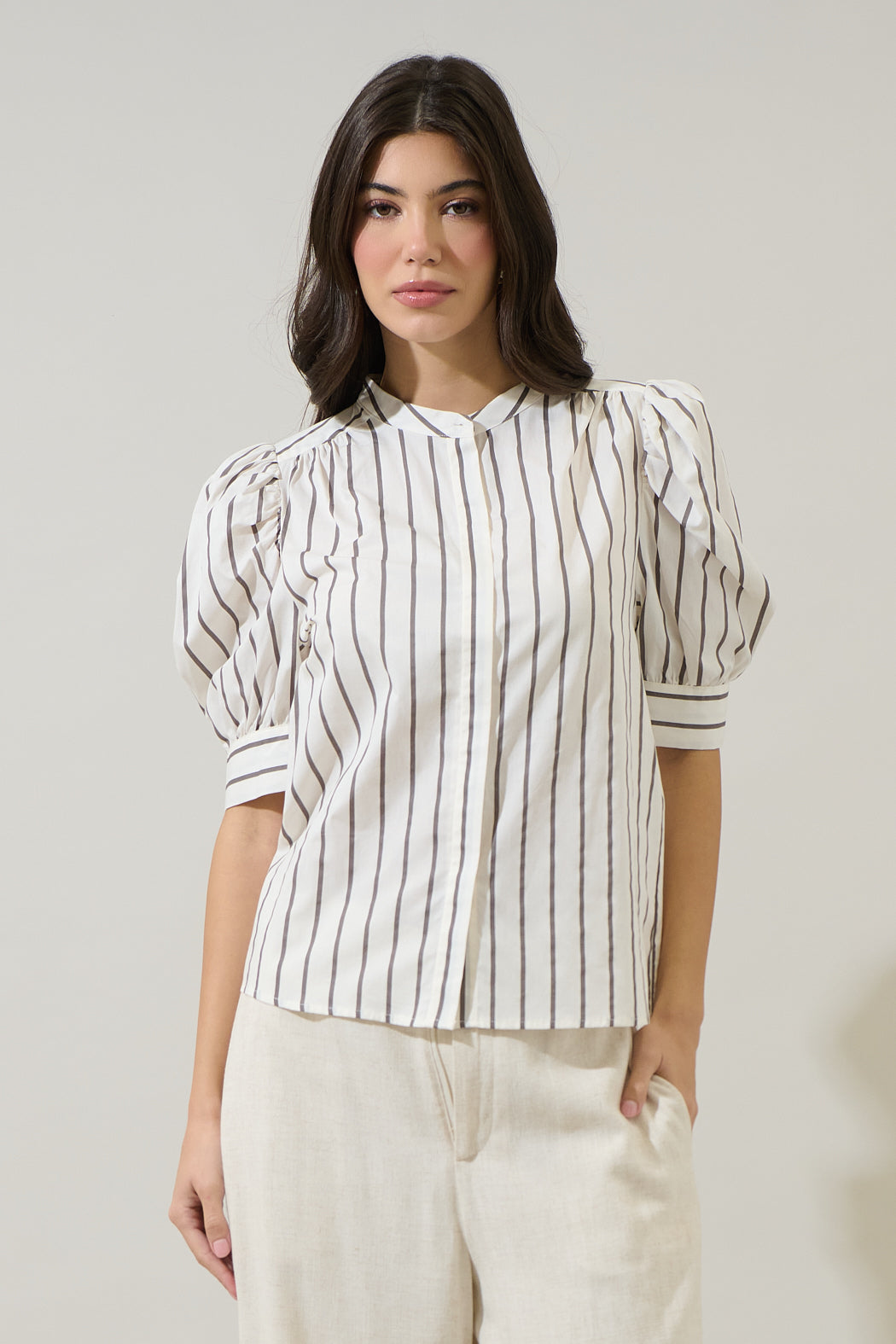 Playful stripes, perfect fit, this top brings all the charm. Short drape sleeves feature a button up front on this top. Its relaxed fit will go perfect with white pants and any shoes of your choice.