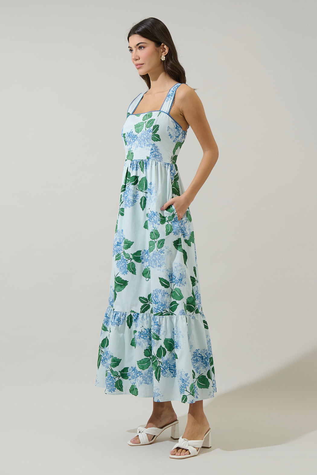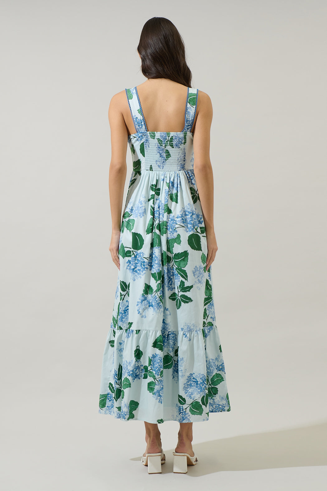We love having many dresses to pick from. A light blue maxi dress with a square neckline, thick straps, a gathered waist, and an all over print of large blue hydrangeas and green foliage. Wear it with strappy heels for a cute look.