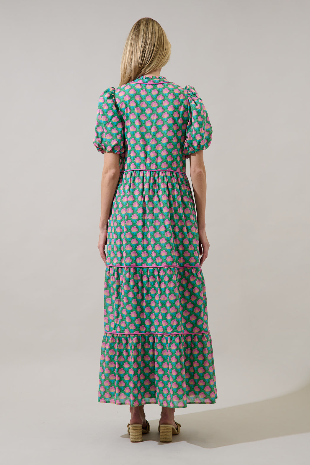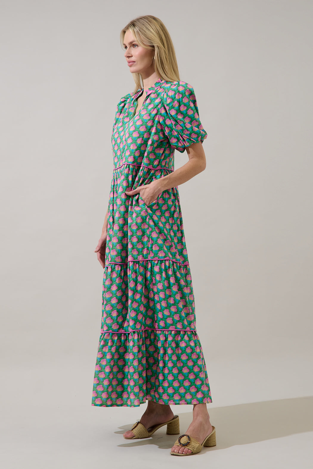 Sweeten your seasonal wardrobe with a perfectly tailored silhouette. Designed with puff sleeves, a split neckline, and a tiered skirt, it flows beautifully with every step. Hidden side pockets add a touch of practicality. Pair it with heels.