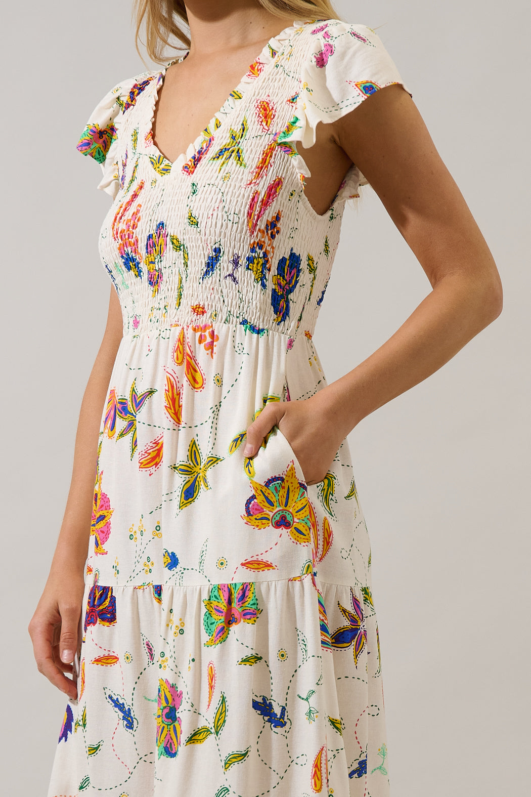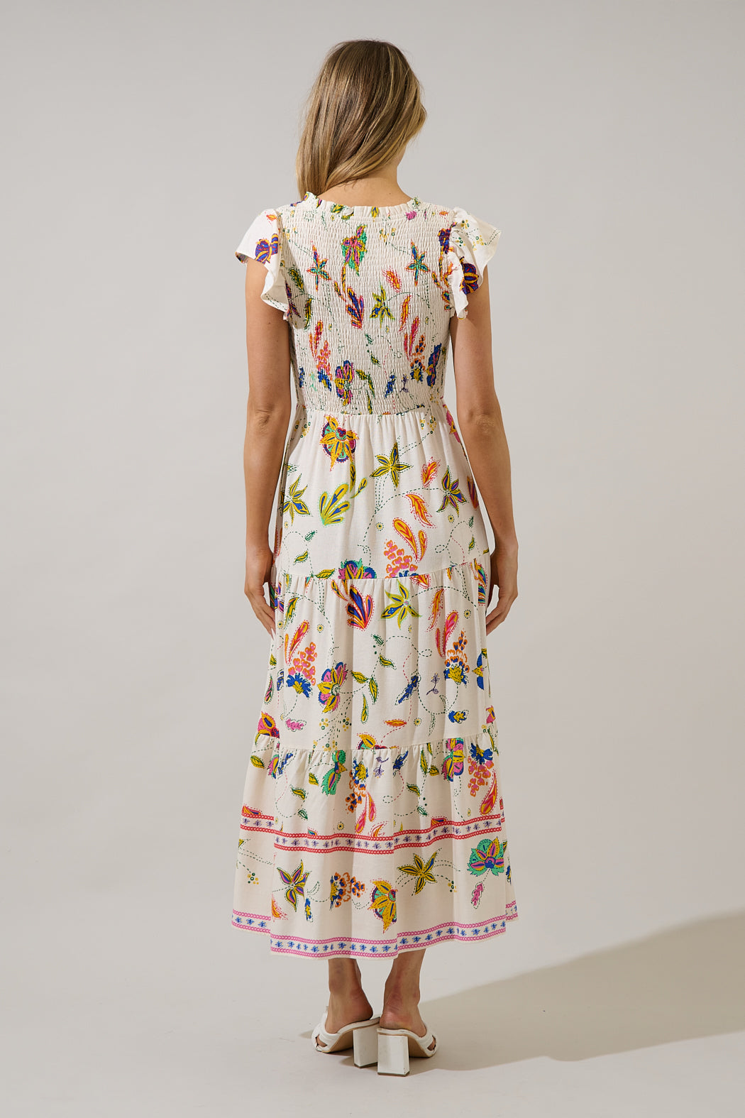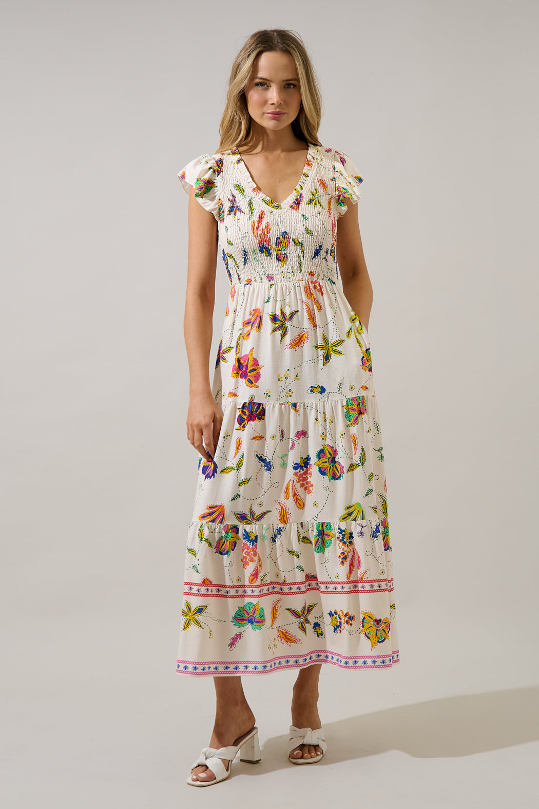 Float through your day in a maxi made for main character moments. It features a flattering smocked bodice with a ruffle V neckline, framed by ruffle cap sleeves. It maintains a fit and flare silhouette with a tiered maxi skirt. Wear sandals or heels to go along.