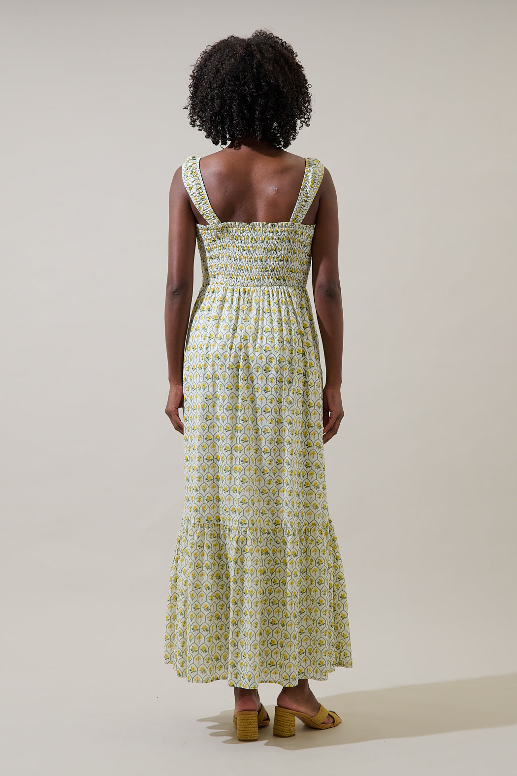 Dive into effortless elegance with this maxi. Ruching shoulder straps frame a smocking body with a midi ruffle hem. Style it with espadrille wedges and a straw tote for the ultimate vibe.
