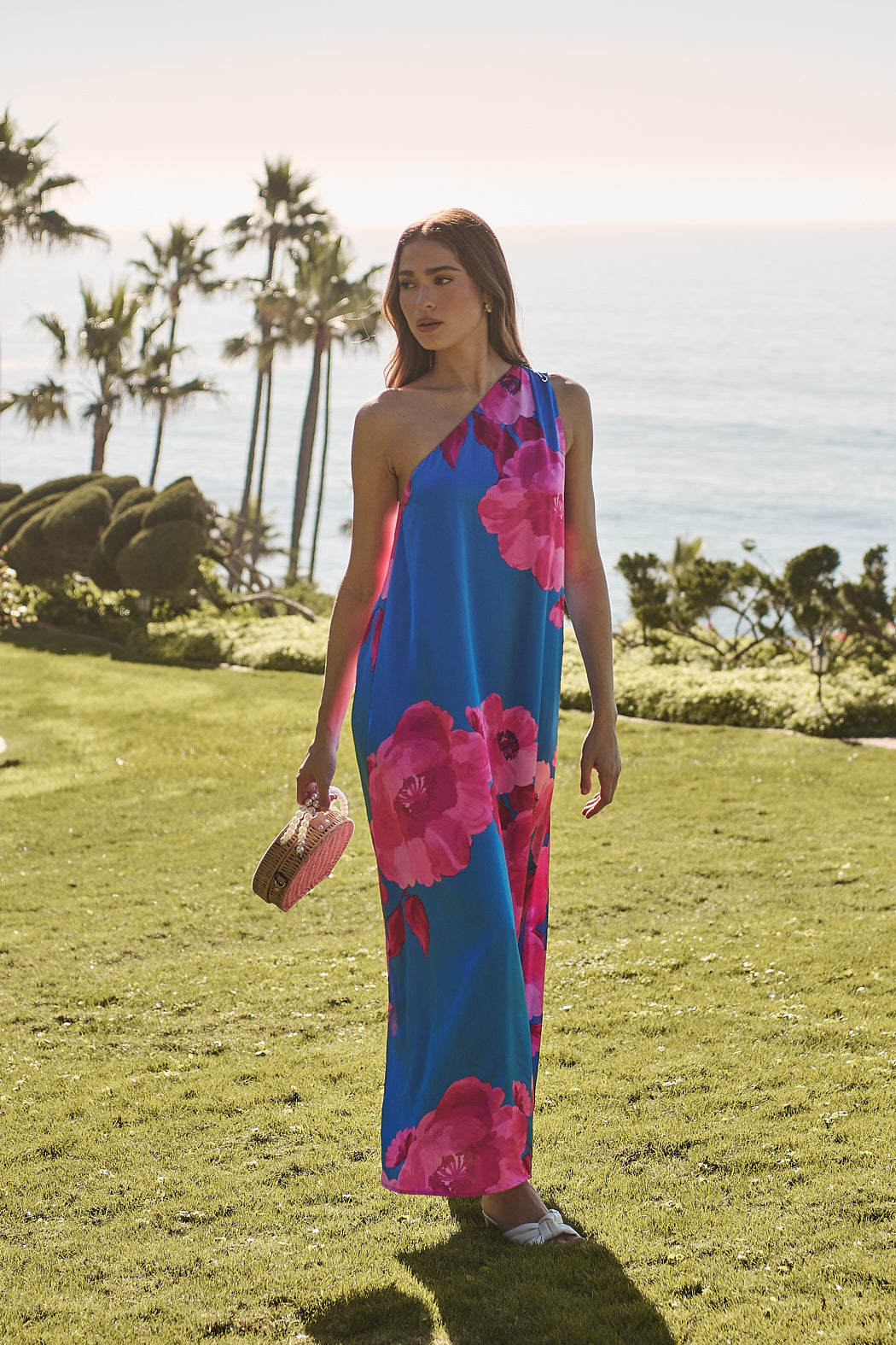 Perfect for casual outings and seasonal events, this dress offers a blend of comfort, elegance, and trend-forward style. A one shoulder pleated sleeve leads to a flowy fit maxi dress. It has an invisible zipper on the side as well as pockets on each side. Blue or green heels would match perfectly.