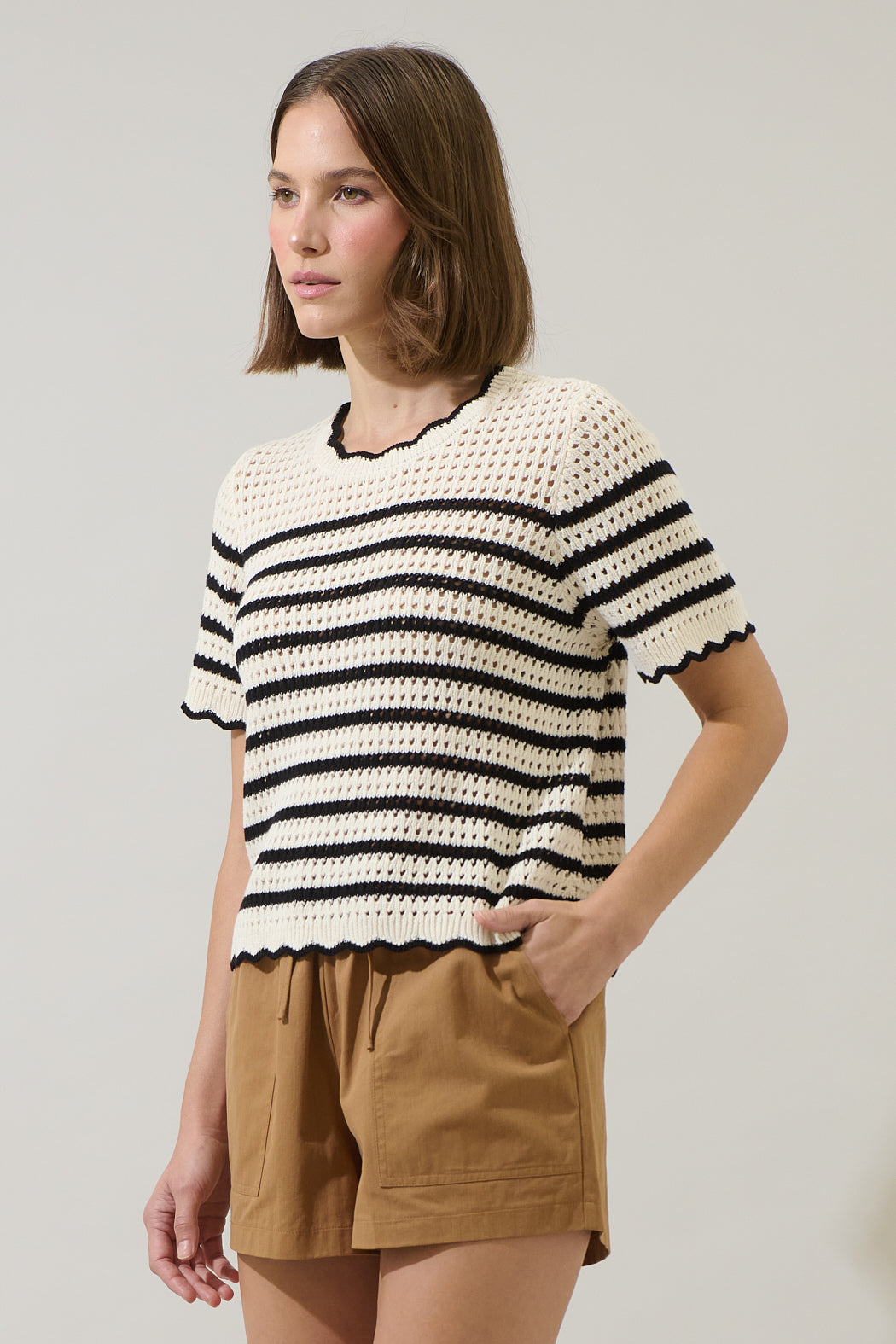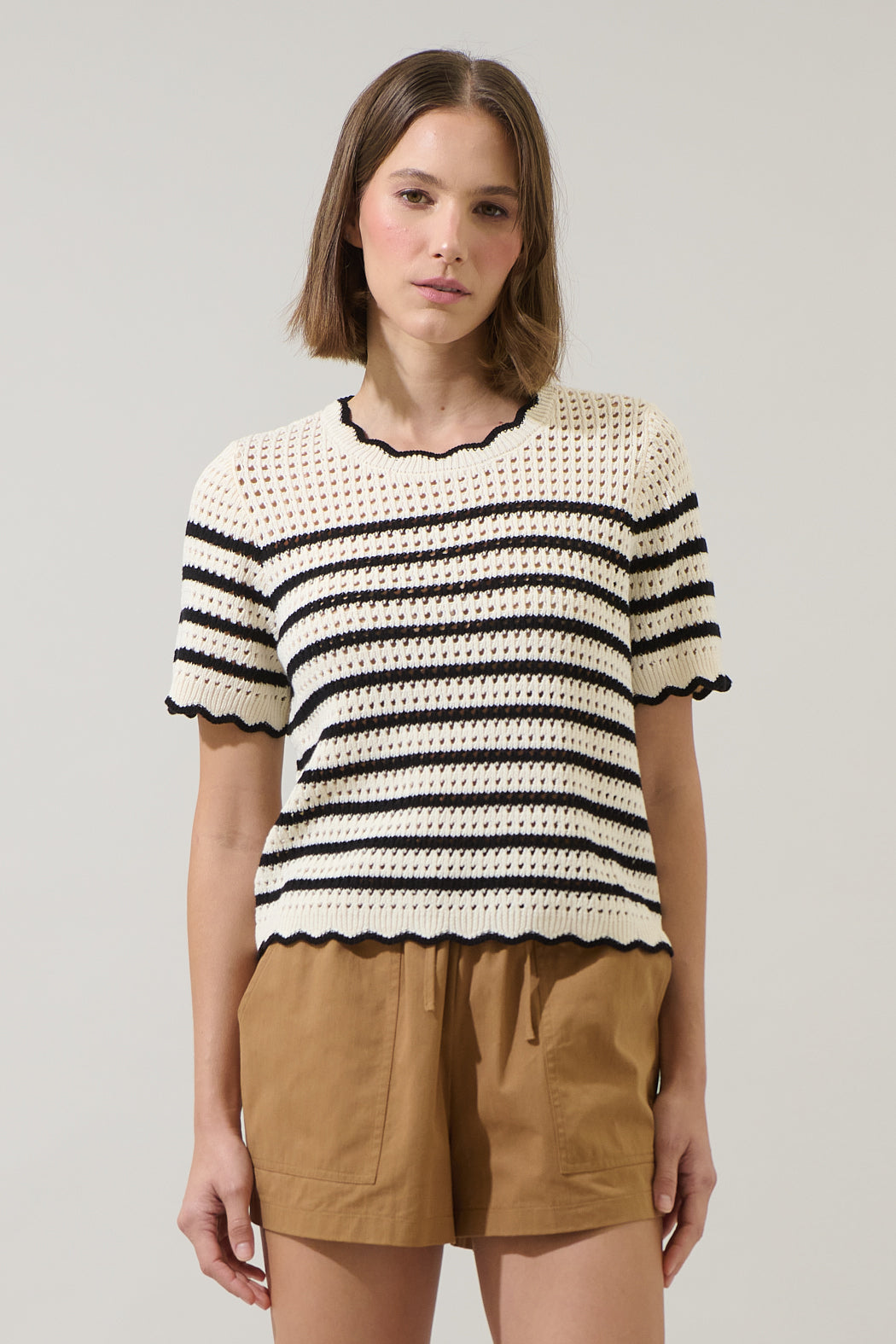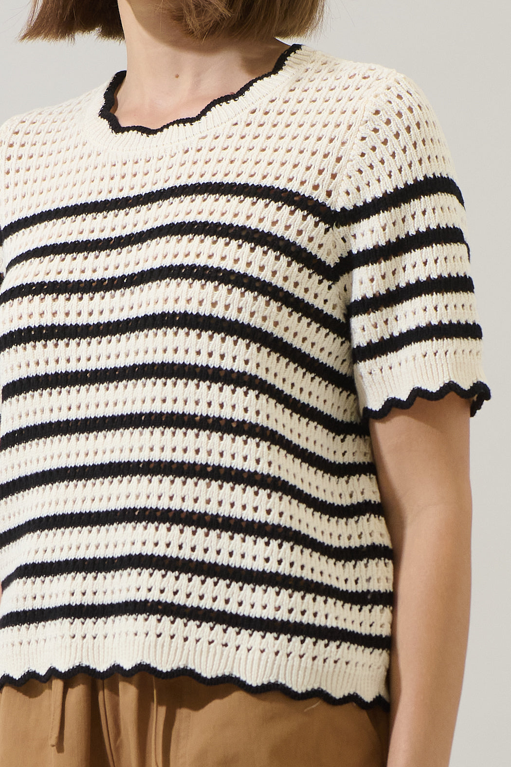Casual, cute, and ready for every outfit combo. This top is a short sleeved, loose knit sweater featuring a striped pattern and scalloped hems. Wear it with any black pants or shorts.