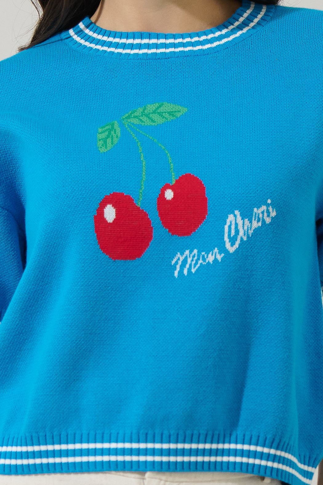 Instantly brighten your closet with this stunning sweater. Crafted in a turquoise blue, the short sleeve sweater has a relaxed fit and is trimmed with classic white stripes on the collar and hem. Pair it with high waisted linen pants for a chic, casual look, or dress it up with a skirt.
