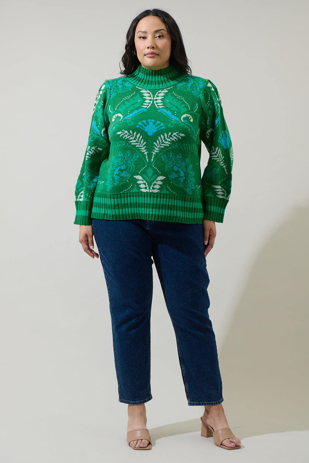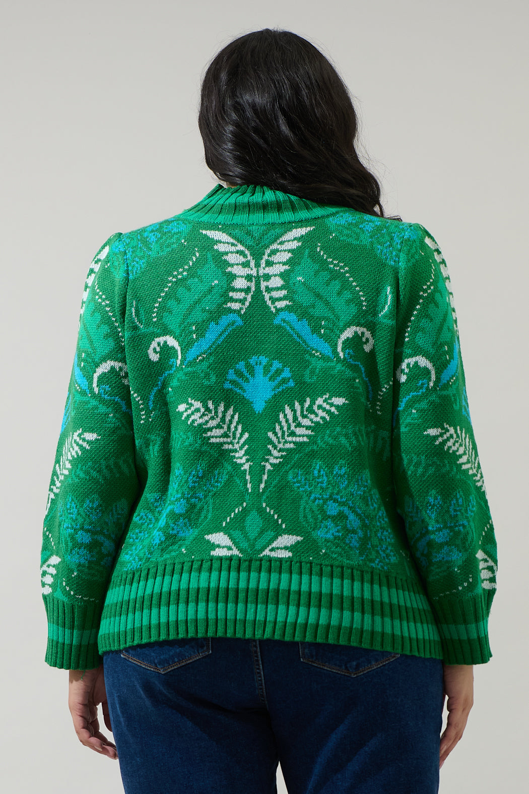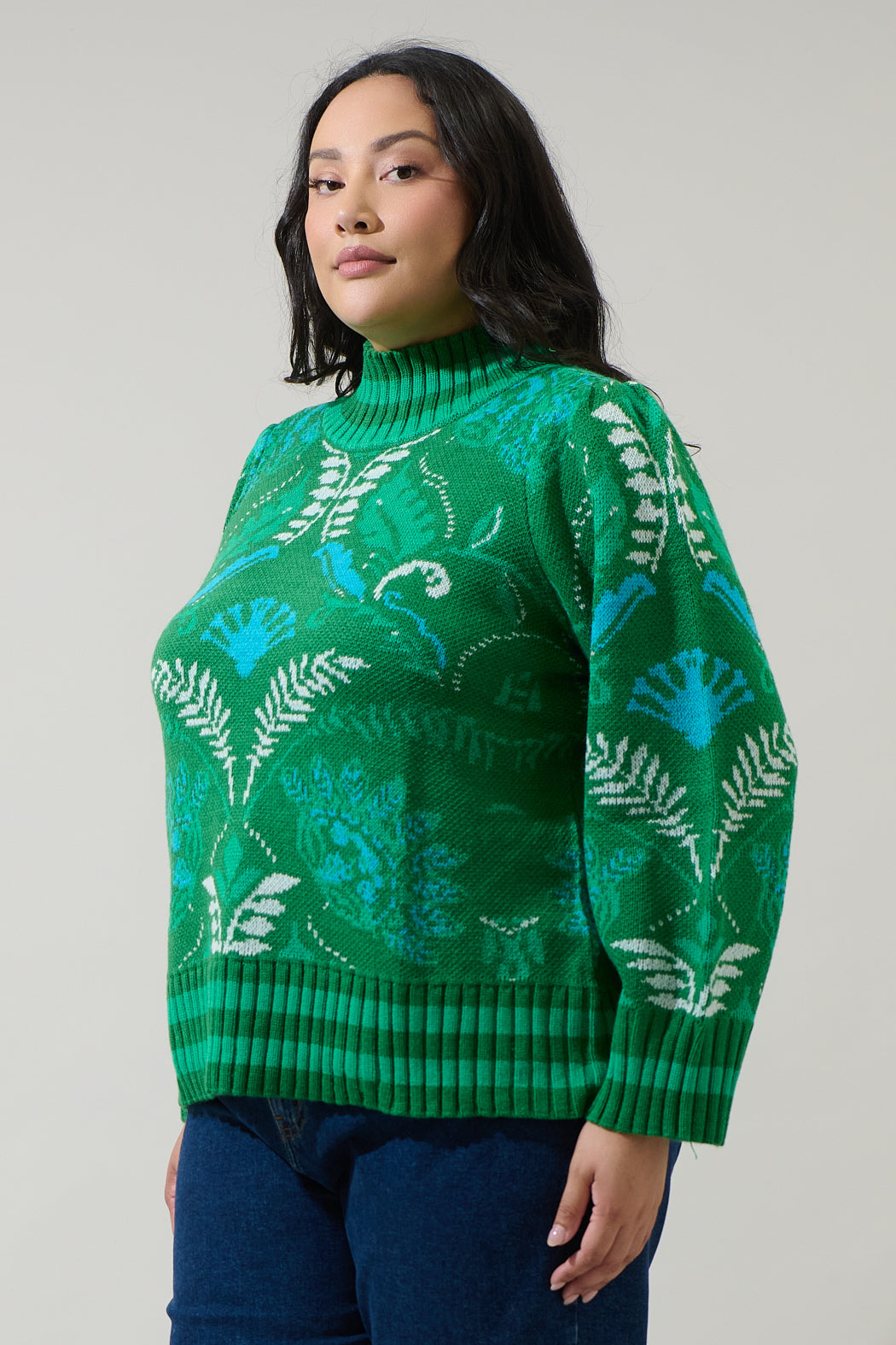 Infuse your fall and winter outfits with color and confidence. This vibrant sweater features an intricate floral inspired pattern in contrasting green and blue, a mock neck, oversized long sleeves, and a fitted silhouette. Pair it with a leather mini skirt and ankle boots to create a standout outfit that’s equal parts cozy and chic.