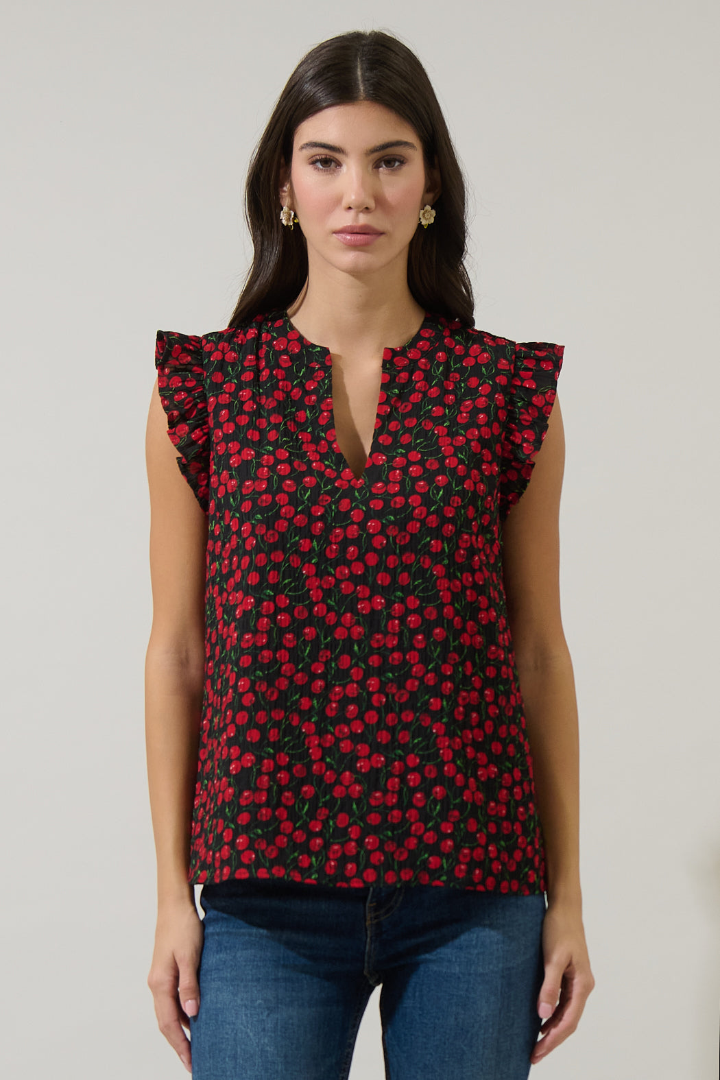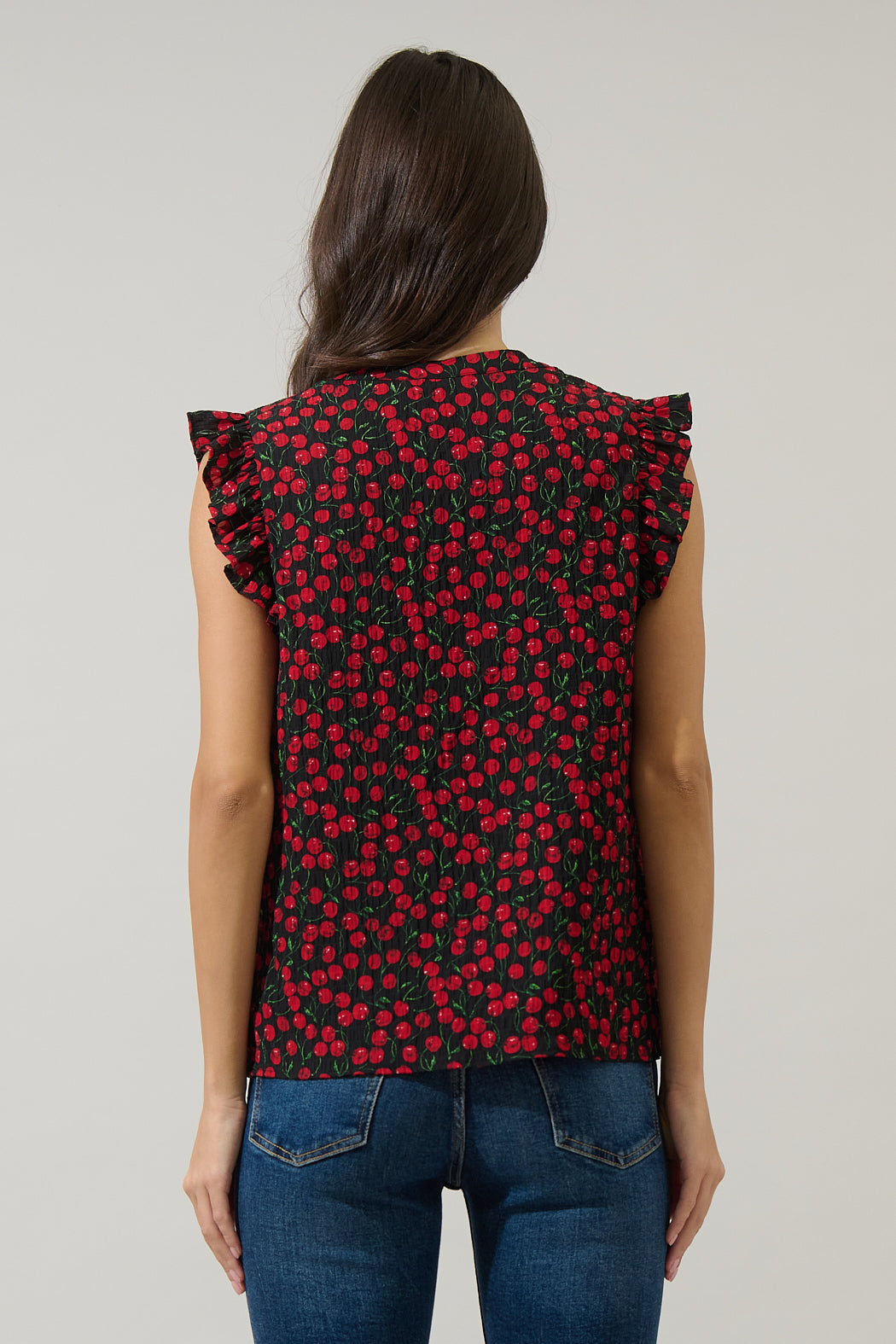 Life’s sweeter in cherries! This playful top has ruffle cap sleeves framing a split neckline. It maintains a relaxed bodice. Pair it with black high waisted pants and red heels.