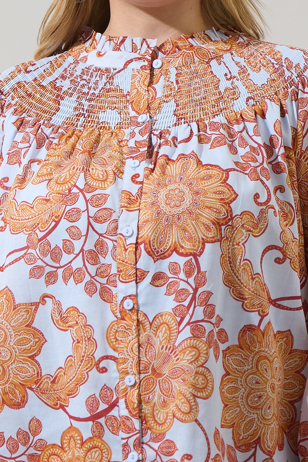 Bring warmth and style to your fall wardrobe with a top made to impress. With a smocked neck, long sleeves, button up front, ruffle neckline trim, smocked sleeves, and a seasonal floral motif, it captures the essence of autumn. Complete the look with jeans and boots for effortless style.