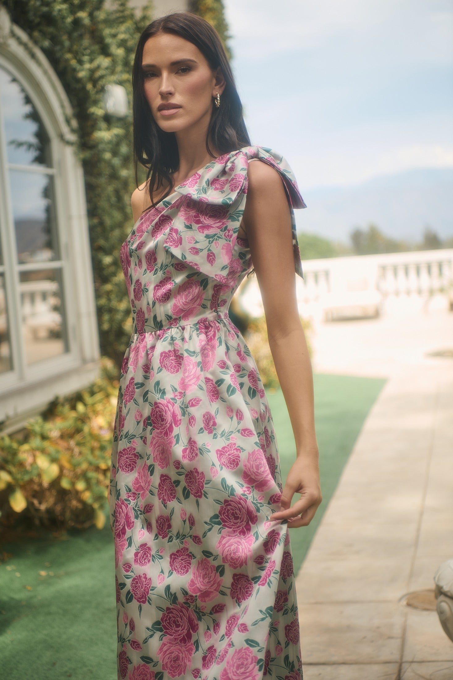 Unleash your inner goddess in this stunning dress that radiates elegance and charm. This figure flattering midi dress features jacquard floral print, an invisible side zipper, and a fit and flare silhouette with a statement bow shoulder detail. Pair with nude heels, a delicate clutch, and gold hoop earrings for a complete, polished look.
