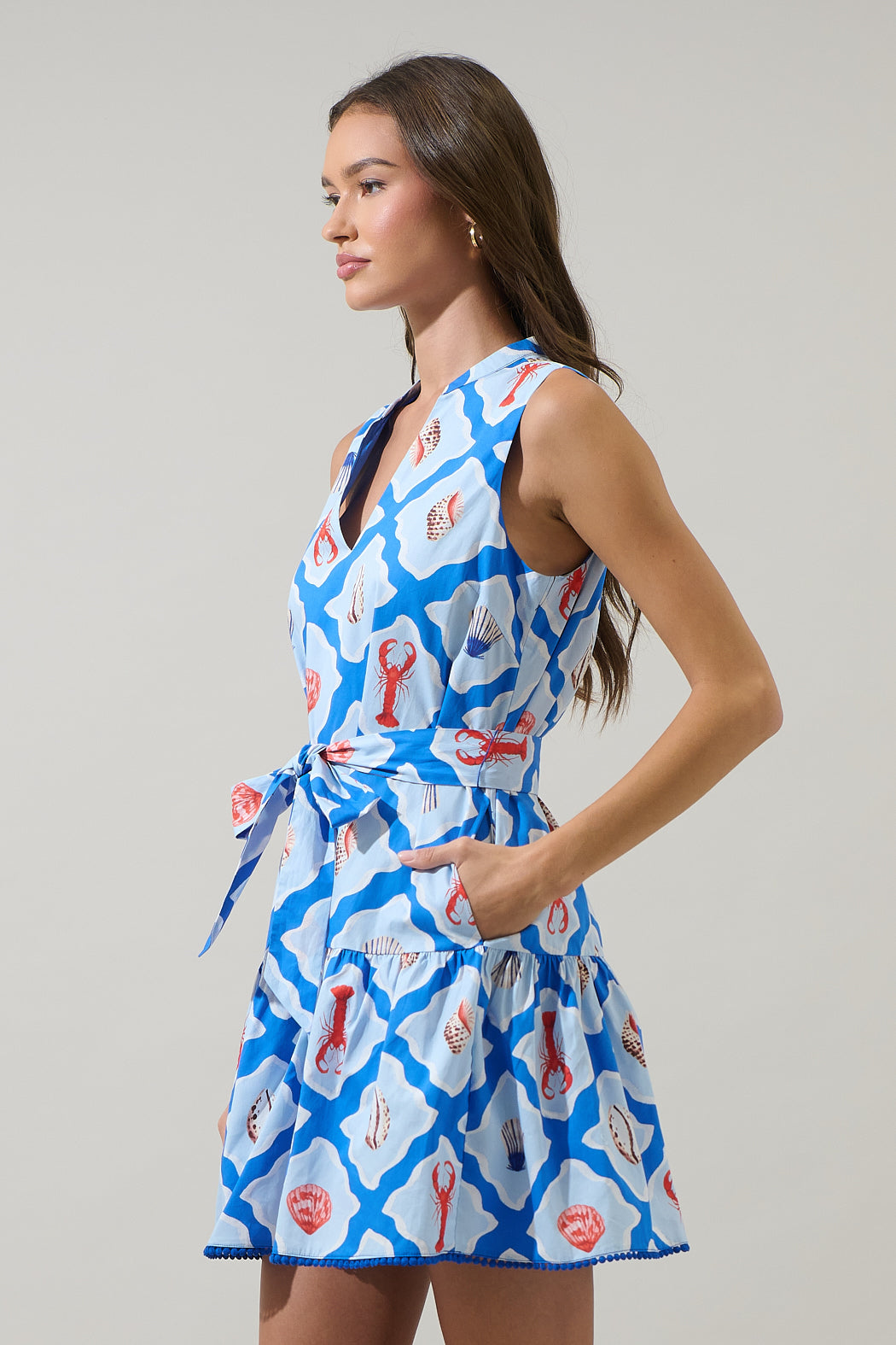 Sunny days call for fun prints and flirty details. Sleeveless with a chic split neck, it features a matching belt to cinch the waist. A playful pom-pom trim along the hem, is ready to be paired with white strappy heels.