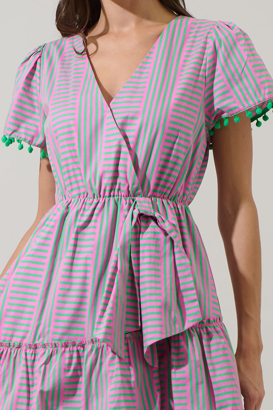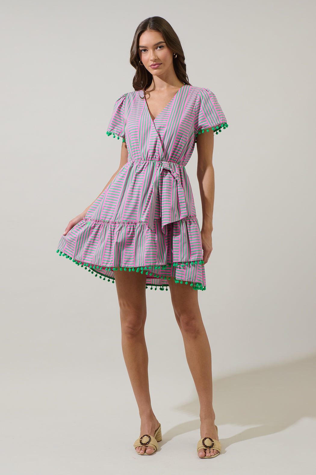 Add a touch of whimsy to your wardrobe with this sweet dress full of feminine flair. It features a playful mini silhouette with pink and green stripes and short ruffled sleeves trimmed with pom poms. The big bow detail at the waist and asymmetrical hem add a fun, flirty finish. Pair it with nude block heels.
