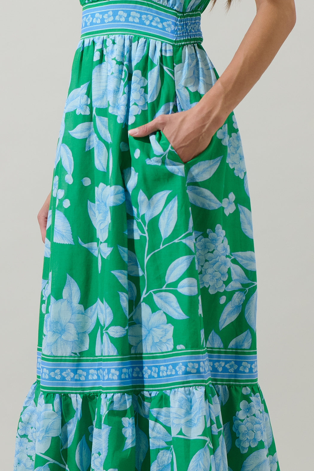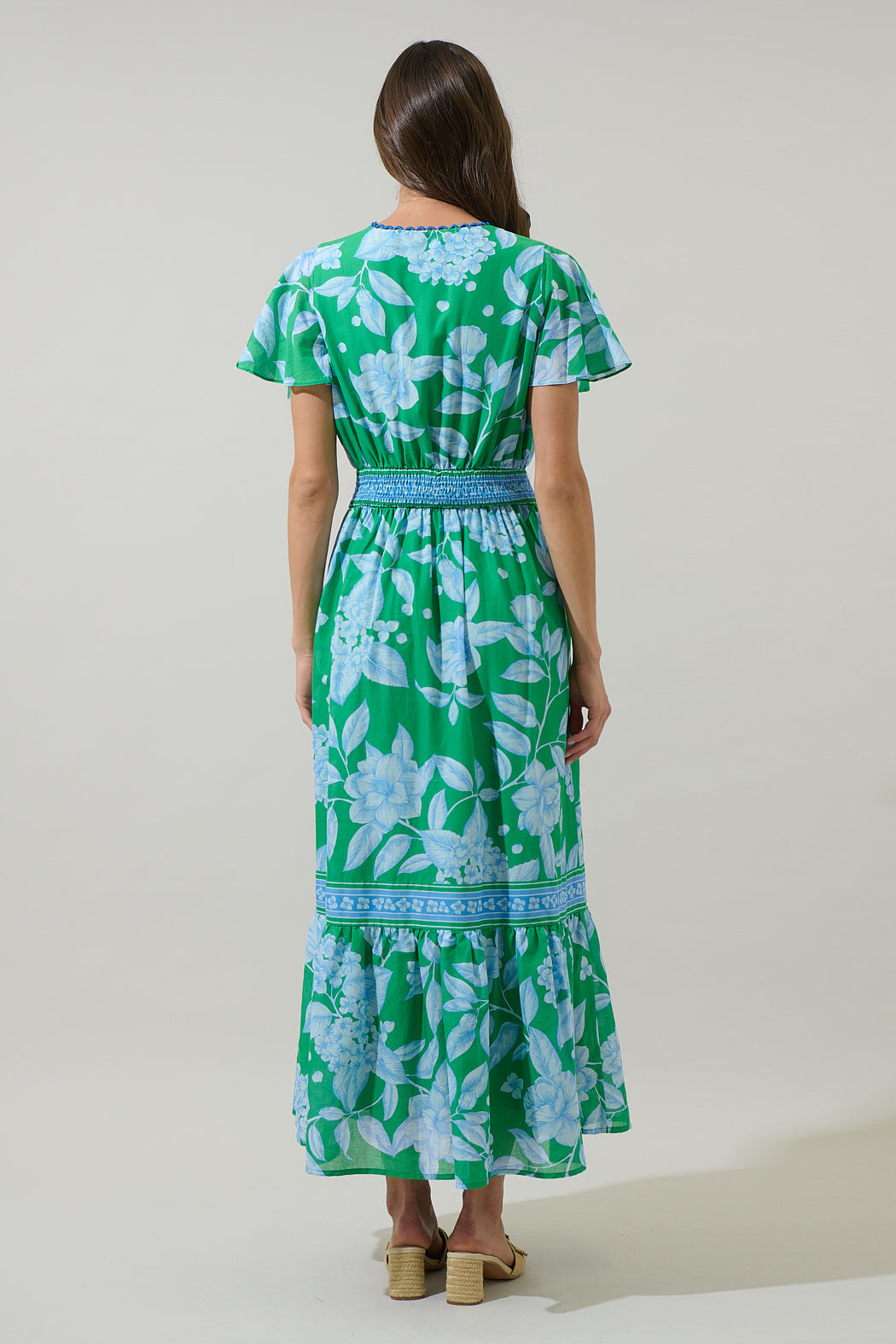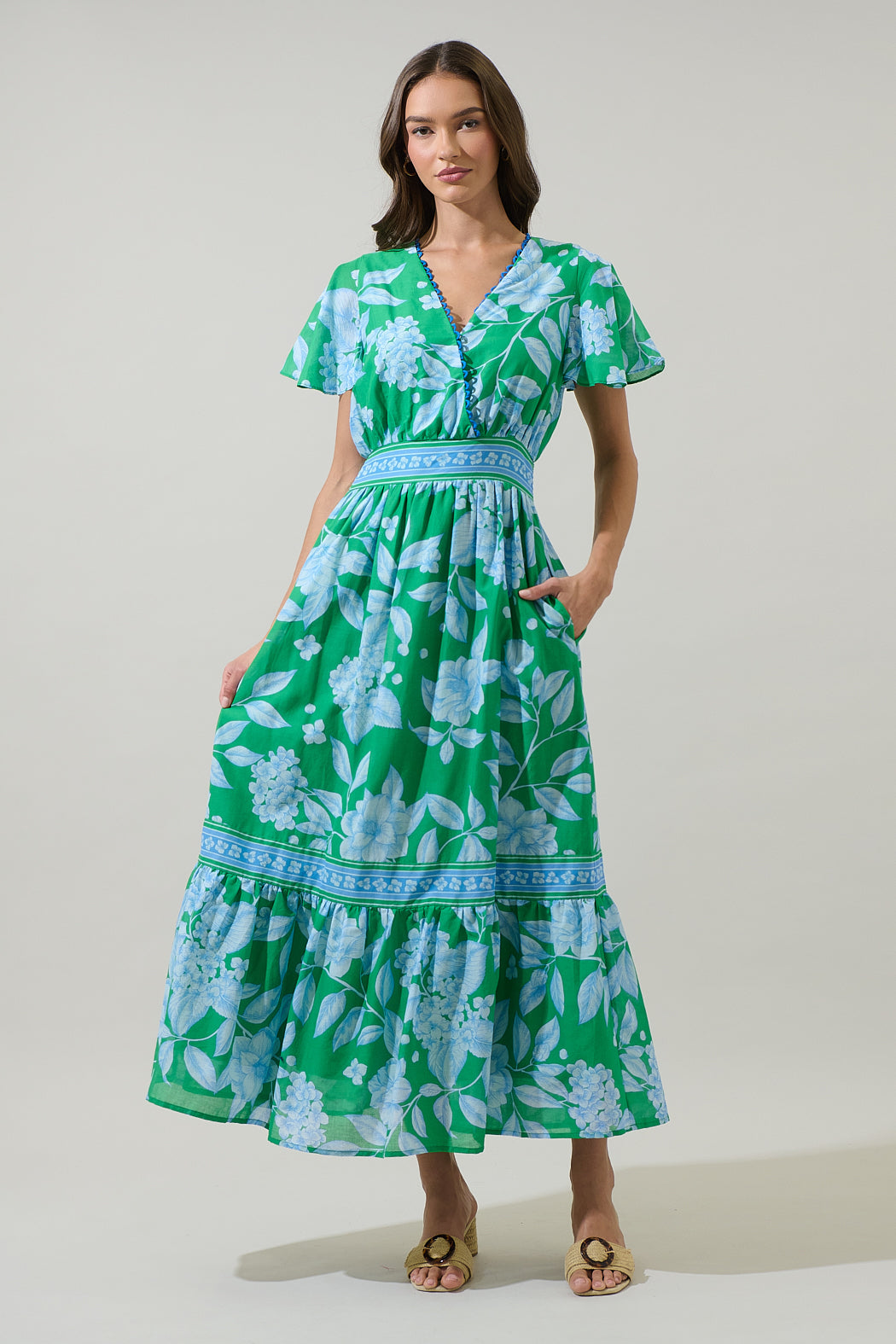 Turn heads in this stunning green and blue floral maxi dress, designed with a flattering wrap-style bodice and flutter sleeve. The flowy fabric moves beautifully, while the cinched waistband highlights your shape in all the right ways. Just add on heels for a cute look.