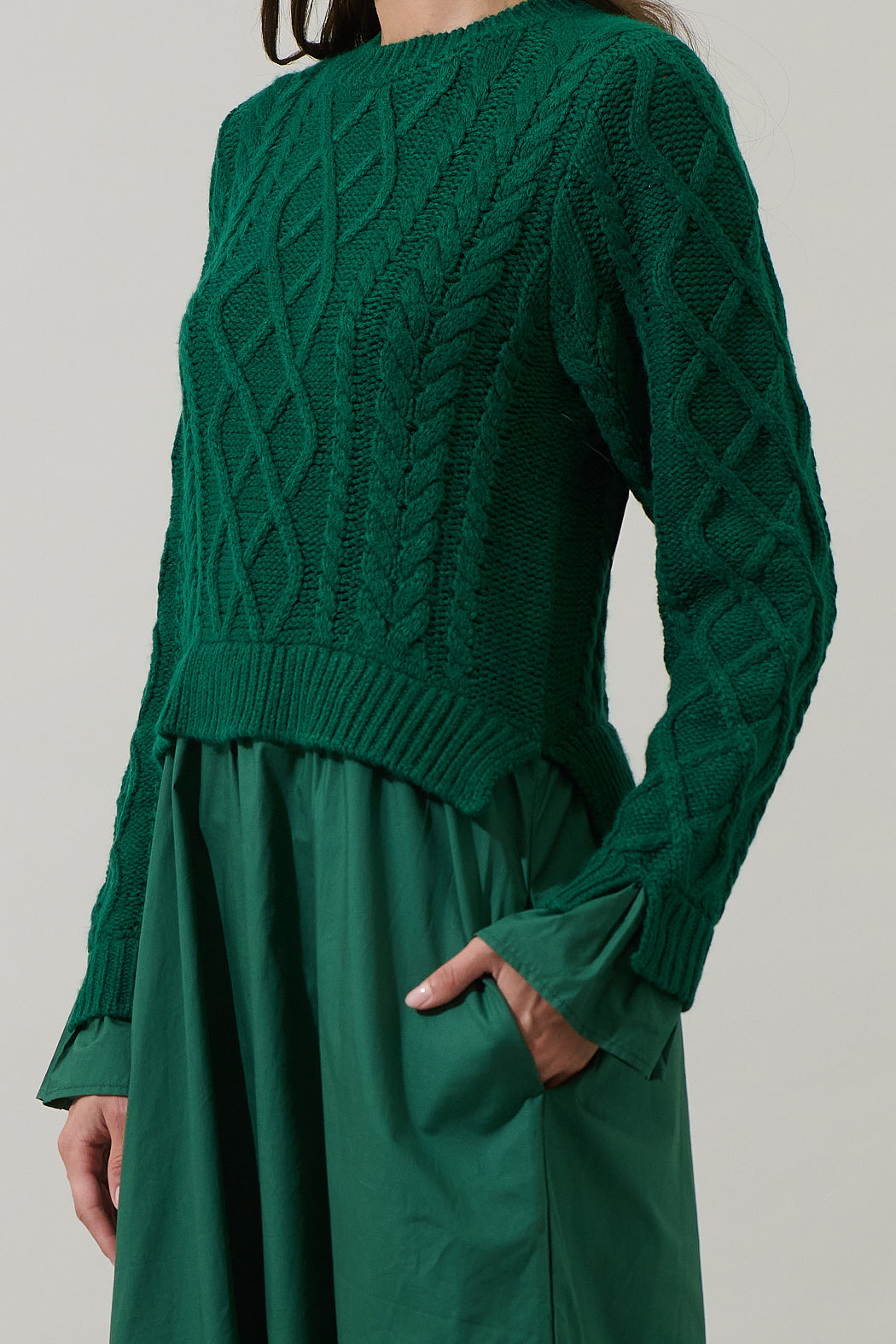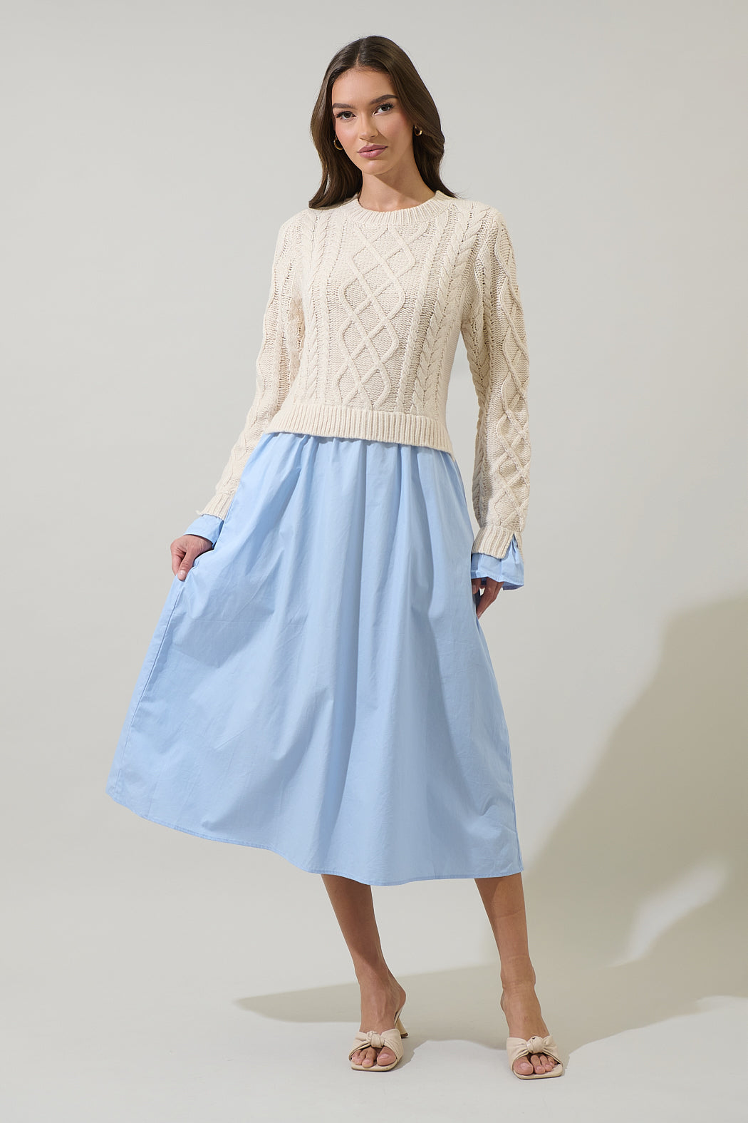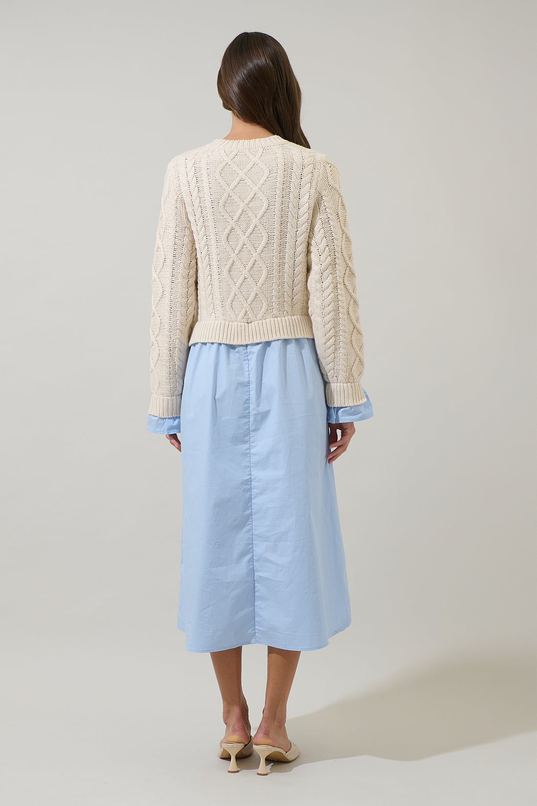 Stay stylish and snug with this perfect blend of sweater and midi dress! Featuring a textured cable knit sweater on top paired with a flowy midi skirt, this dress combines warmth, style, and comfort in one effortless piece. Pair it with ankle boots and a crossbody bag for a chic and cozy look that’s perfect for any occasion.