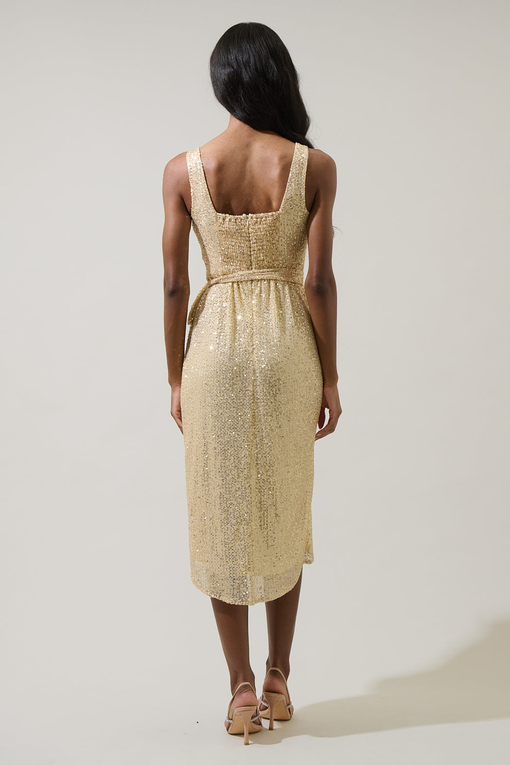 Shine bright in this dazzling dress. This stunning sequin dress features a flattering sweetheart neckline and sleeveless design. The wrap-around silhouette leads to a side tie. Pair it with metallic heels and a sleek clutch for a show-stopping look.