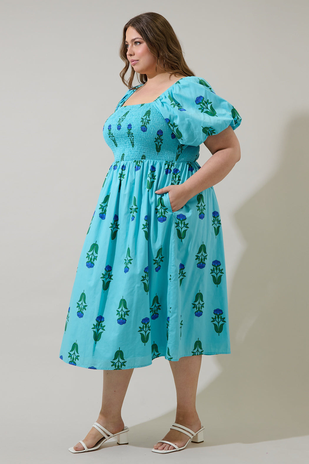 Loving is easy in this flirty spring fave. A floral print catches all eyes in these bubble short sleeves and smocked body. It ends at a midi length. White or blue heels match perfectly.