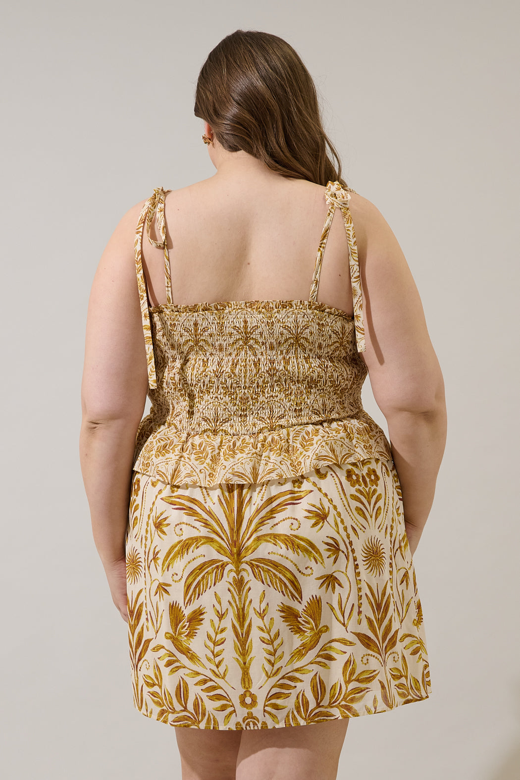 Get instant resort vibes with this mini dress. The top features a flattering smocked bodice and delicate tie up straps, leading into a chic peplum ruffle that defines the waist. The skirt flows into a high-waisted mini cut, making this dress the perfect piece to pair with heels.