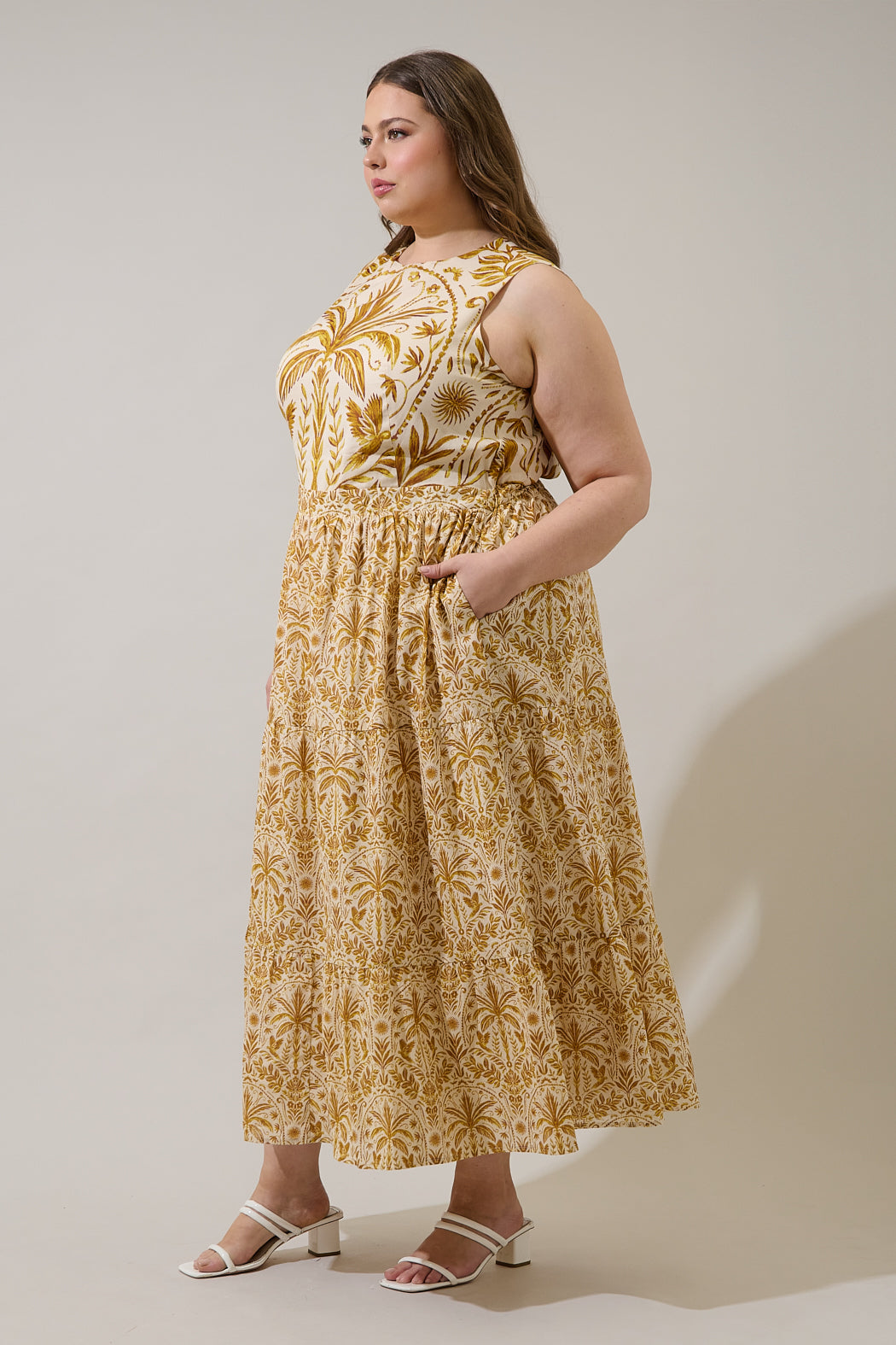 Escape the everyday with the Calina Tropical Jivie Tiered Maxi Dress. It features a tropical print with a sleeveless design including subtle cutouts and tie details at the sides. The tiered skirt flows gracefully to a maxi length. Pair it with woven heels.