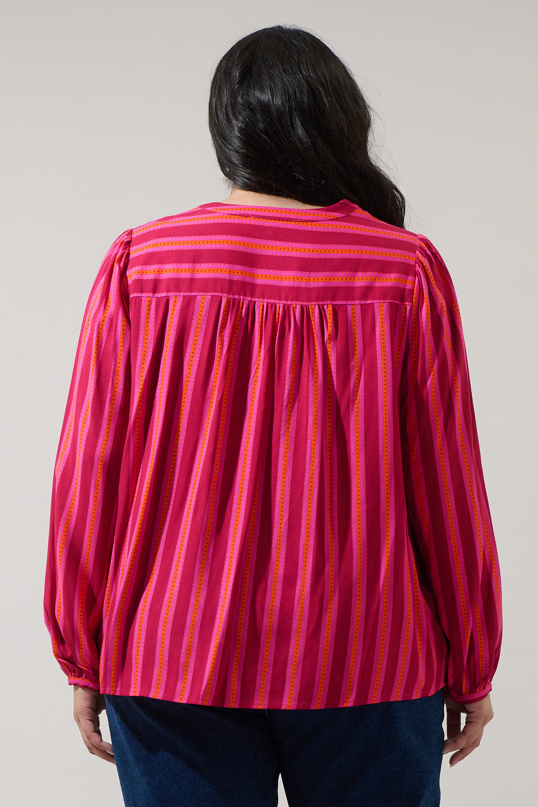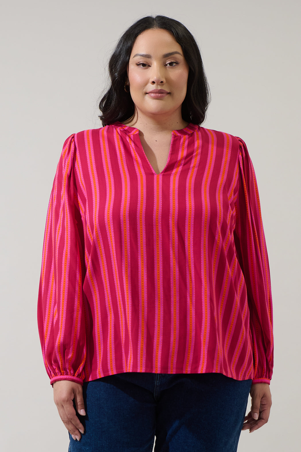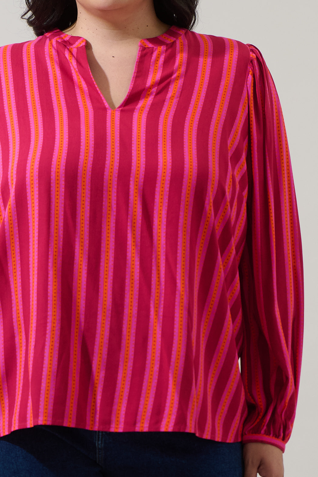 Add a pop of color to your wardrobe with a versatile top that's perfect for any occasion. This top features long balloon sleeves, a stylish split neckline, and a bold striped pattern that stands out. Pair it with skinny jeans and heels for a chic evening look, or tuck it into high waisted trousers for a smart, casual outfit.