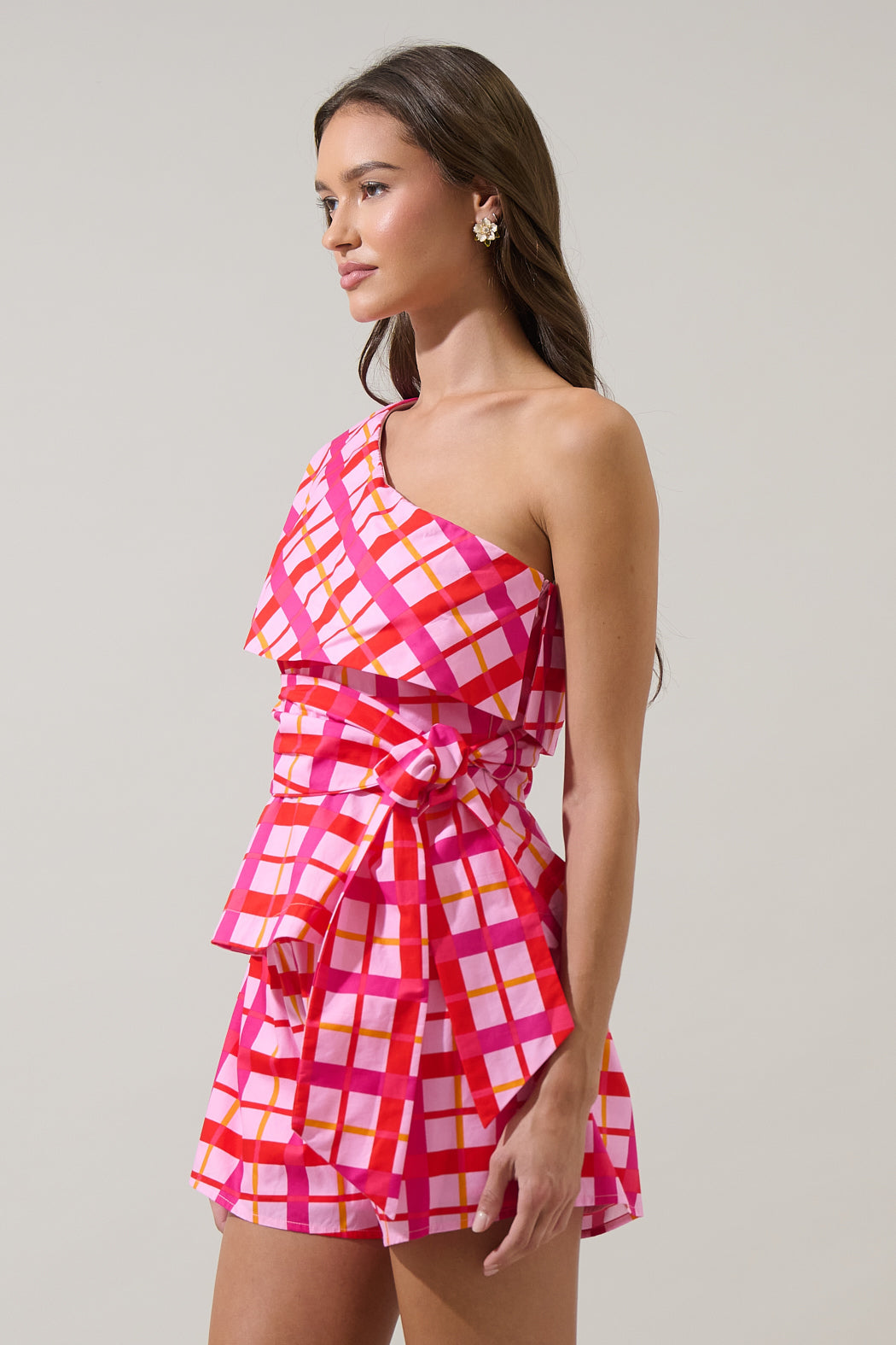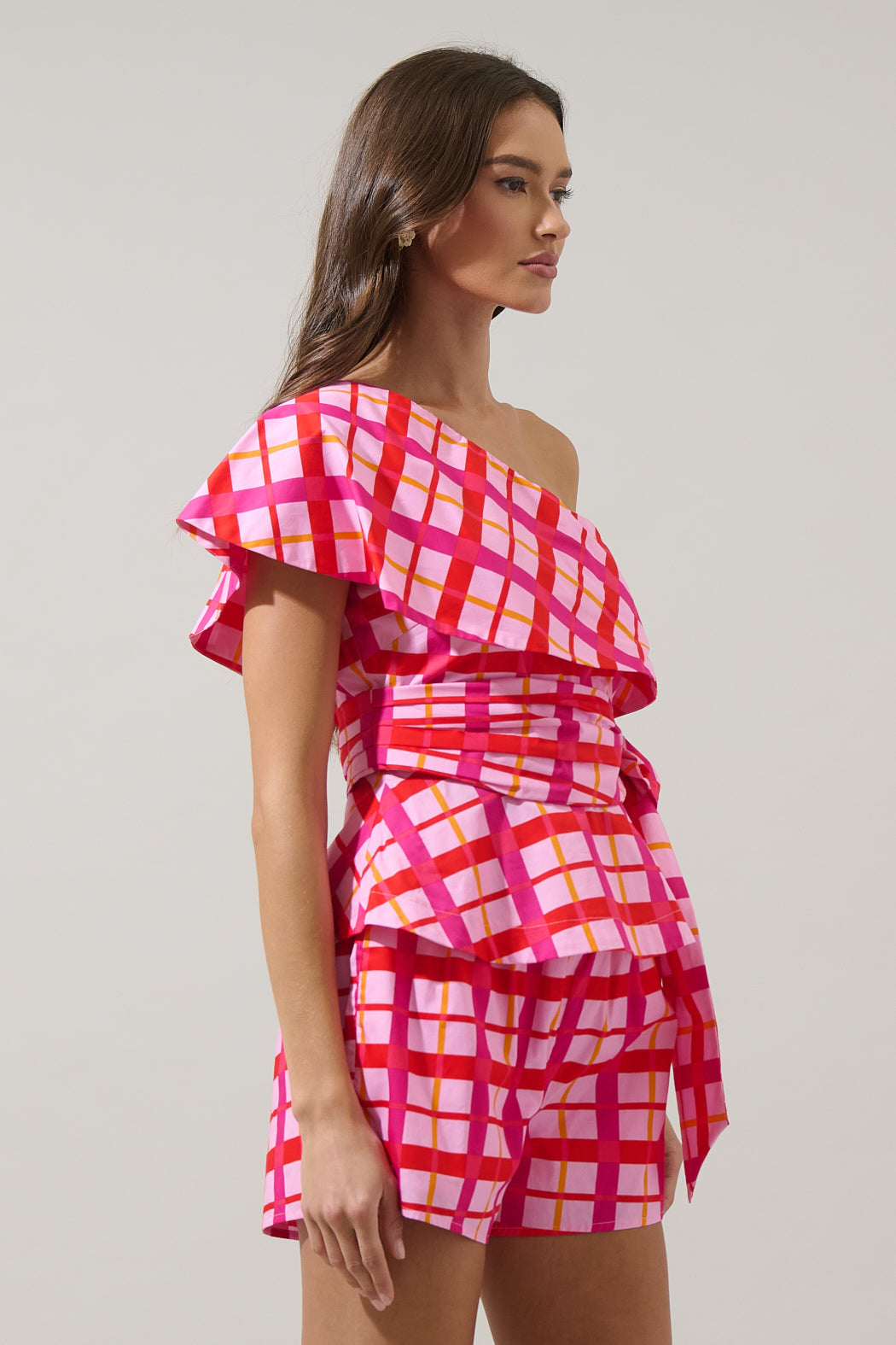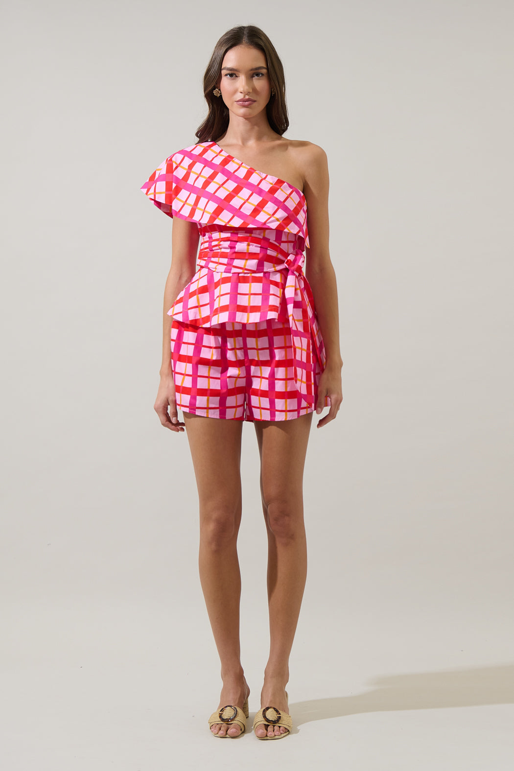 Turn heads with this cute top, featuring a one shoulder look. The waist tie accentuates your silhouette, while the peplum flare adds a flirty, feminine touch. Style it with the matching shorts for a complete look.