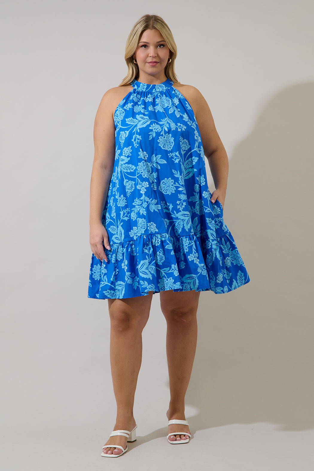 Blue florals, sunny moods, and compliments guaranteed. This dress features a high halter neckline that tops a sleeveless style. It maintains a shift silhouette, featuring a keyhole in the back. Wear it with a sun hat and strappy sandals.