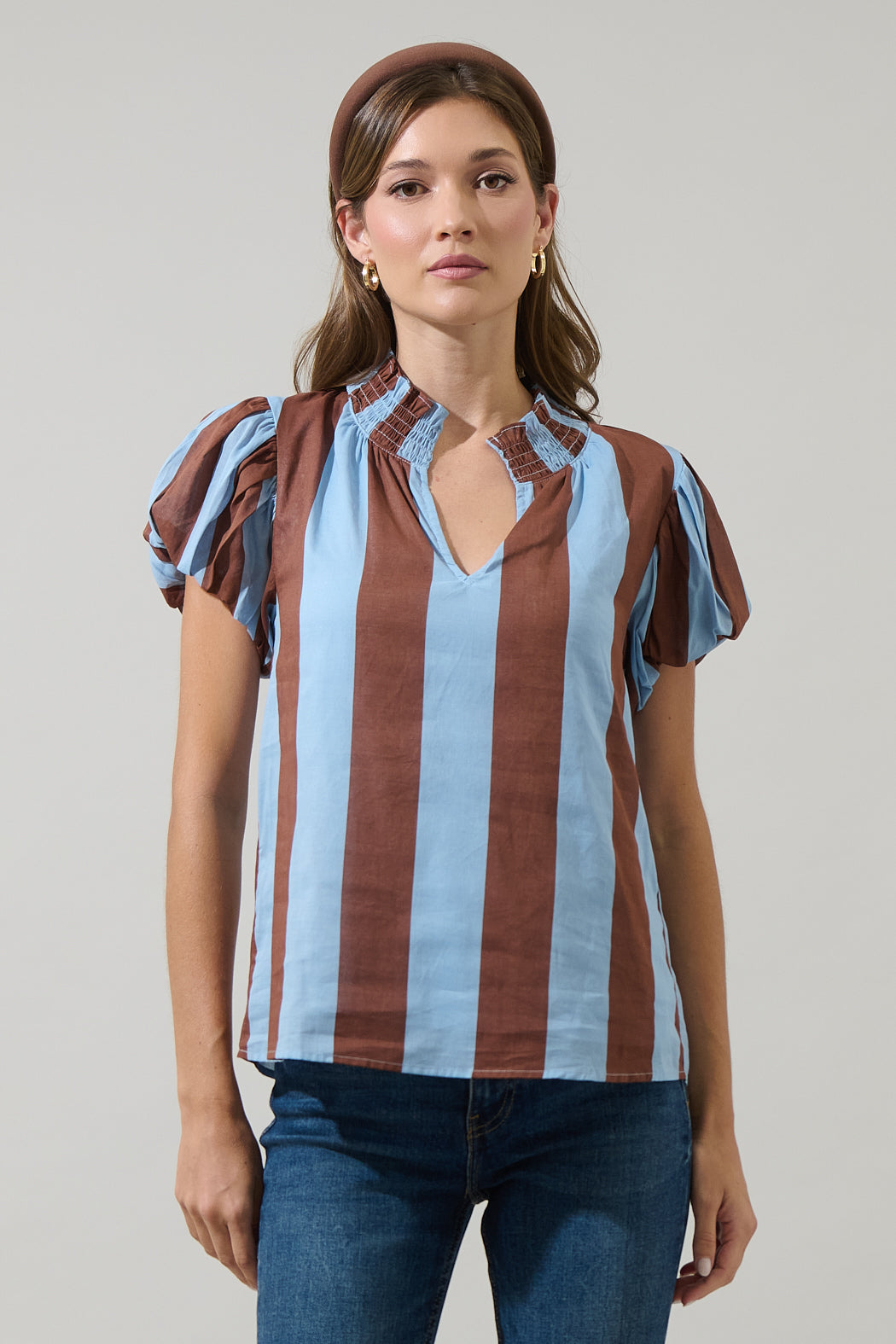 A must-have piece for when you want comfy and stylish rolled into one. Bubble short sleeves frame a split neckline that leads to a smocked neck. Pair it with high-waisted trousers and heeled mules for a chic, put-together look, or keep it casual with skinny jeans and sneakers.