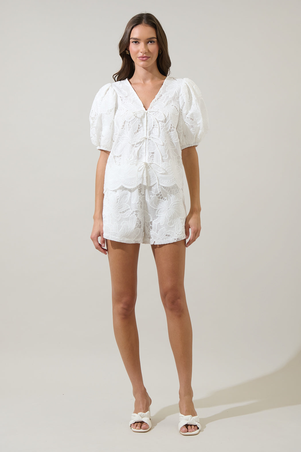 Easy, breezy, and made for warm days ahead. This top features a tie front and puff sleeves for a touch of cuteness. Its scallop edge adds fun twist. Pair it with the matching shorts for a full look.