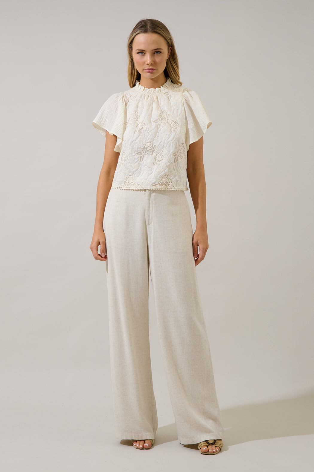 Elevate your seasonal rotation with a piece that balances vintage charm and contemporary ease. It features flutter short sleeves with a ruffle mock neck. Finished with a dainty pom pom lace hemline. Pair it with your favorite jeans.
