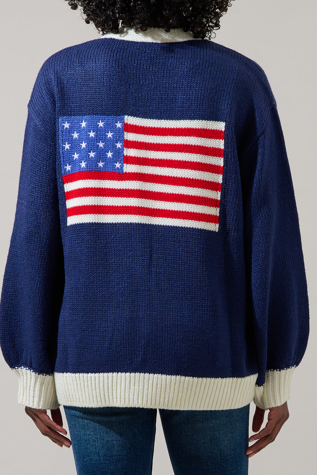 Celebrate your everyday American pride with a cardigan that makes a subtle statement of style and patriotism. Featuring a bold American flag on the back, and long sleeves for cozy wear. Pair it with white sneakers and a crossbody bag for a casual look.