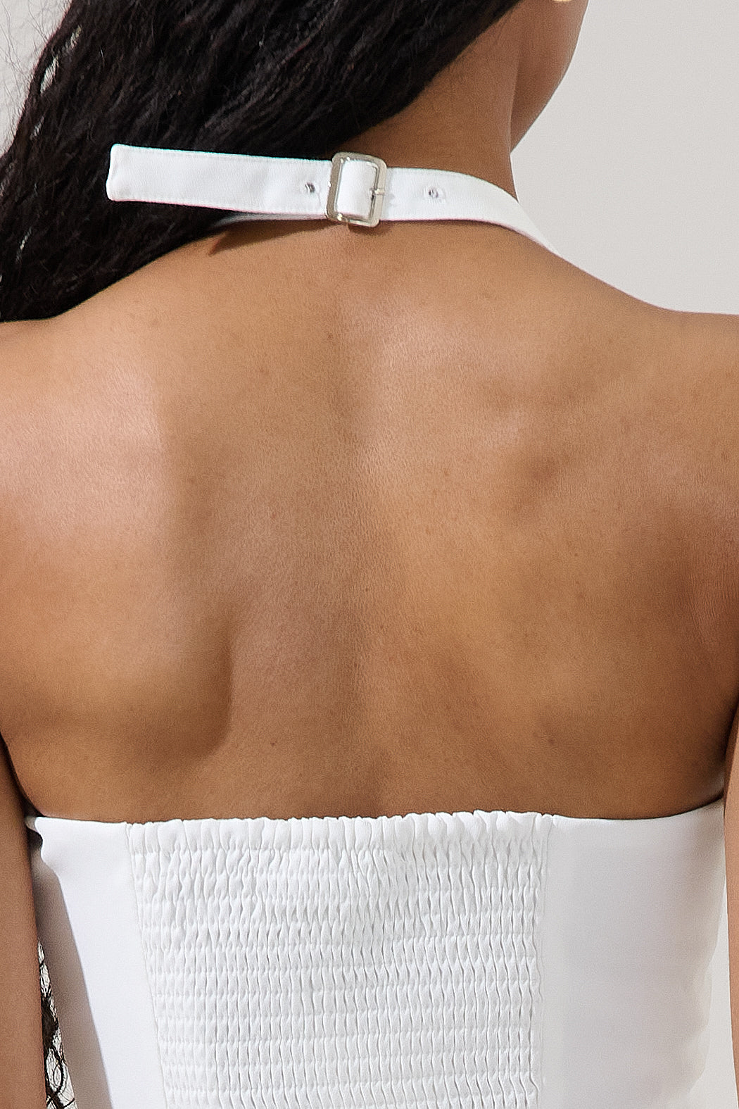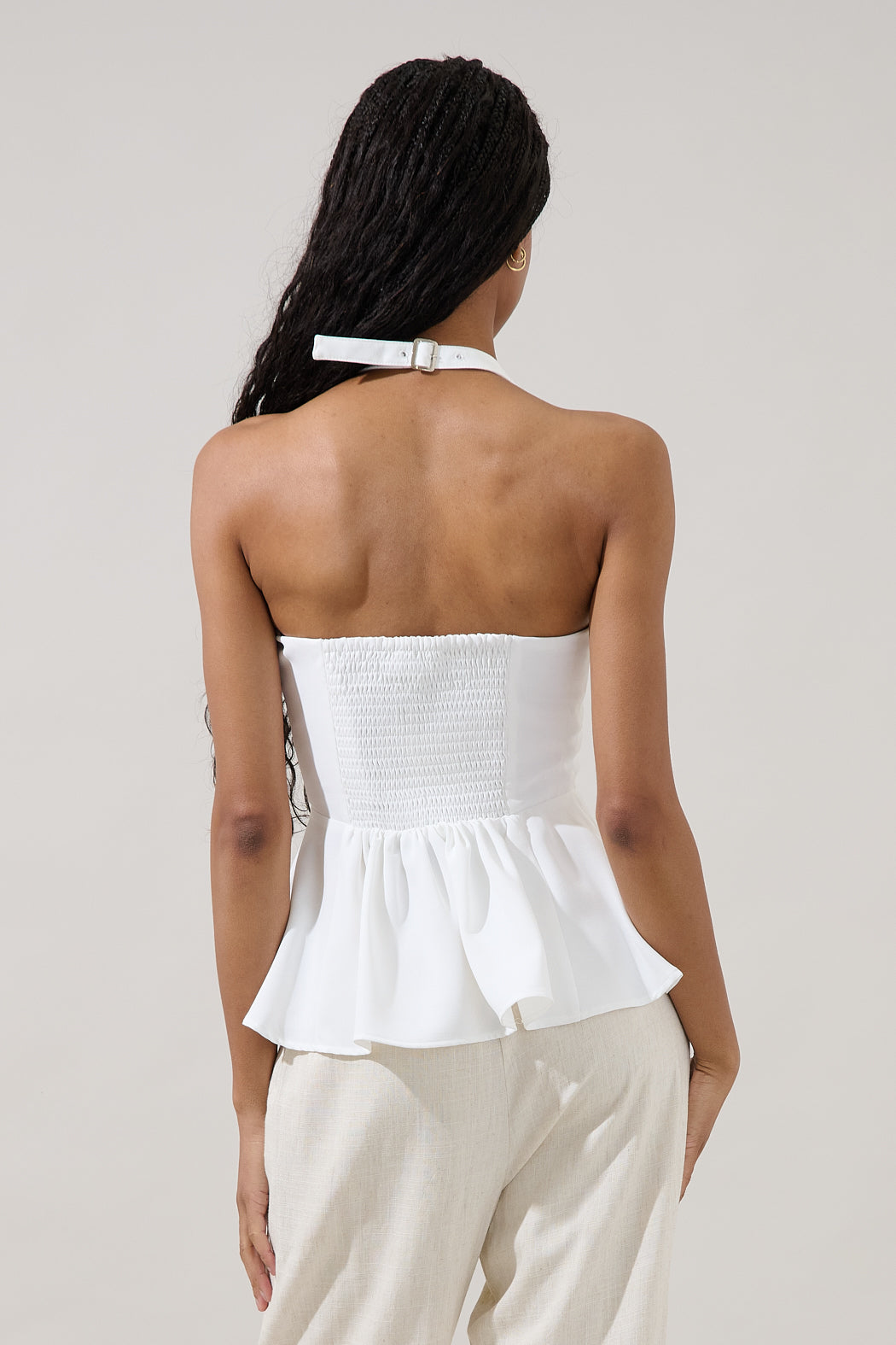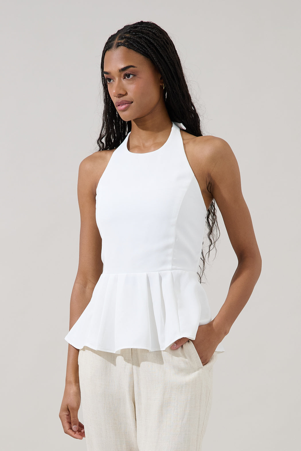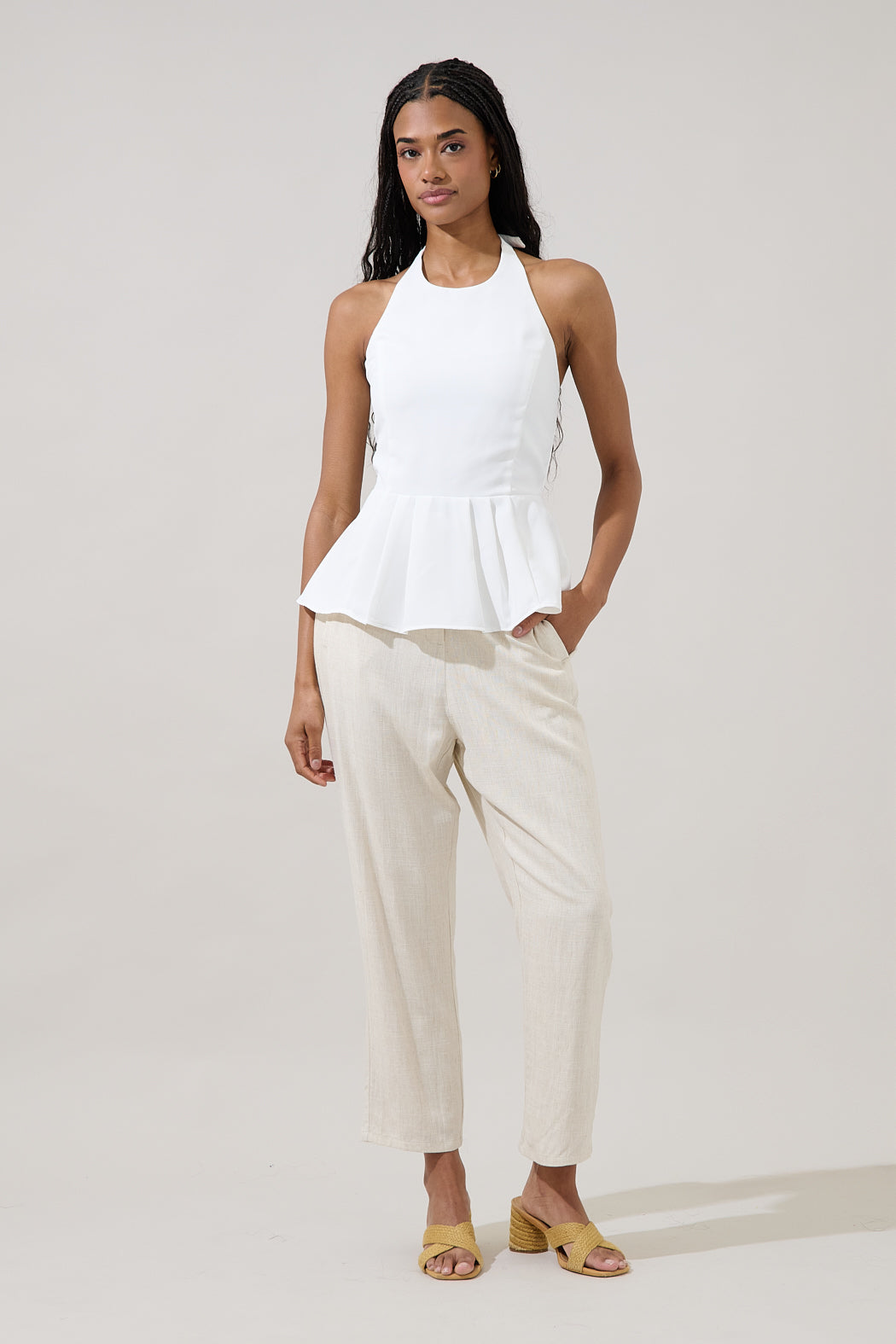 Clean, chic, and effortlessly flattering! This white halter top is a total wardrobe win. Featuring a sleek halter neckline and a softly flared peplum hem, it cinches at the waist for a feminine, polished silhouette. Perfect for dressing up denim pants.