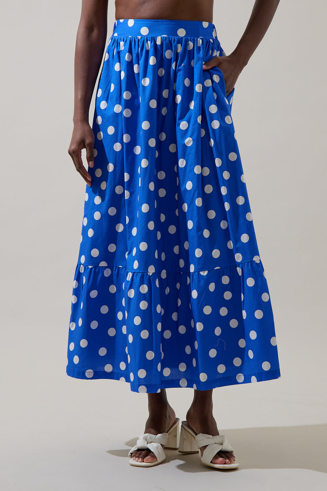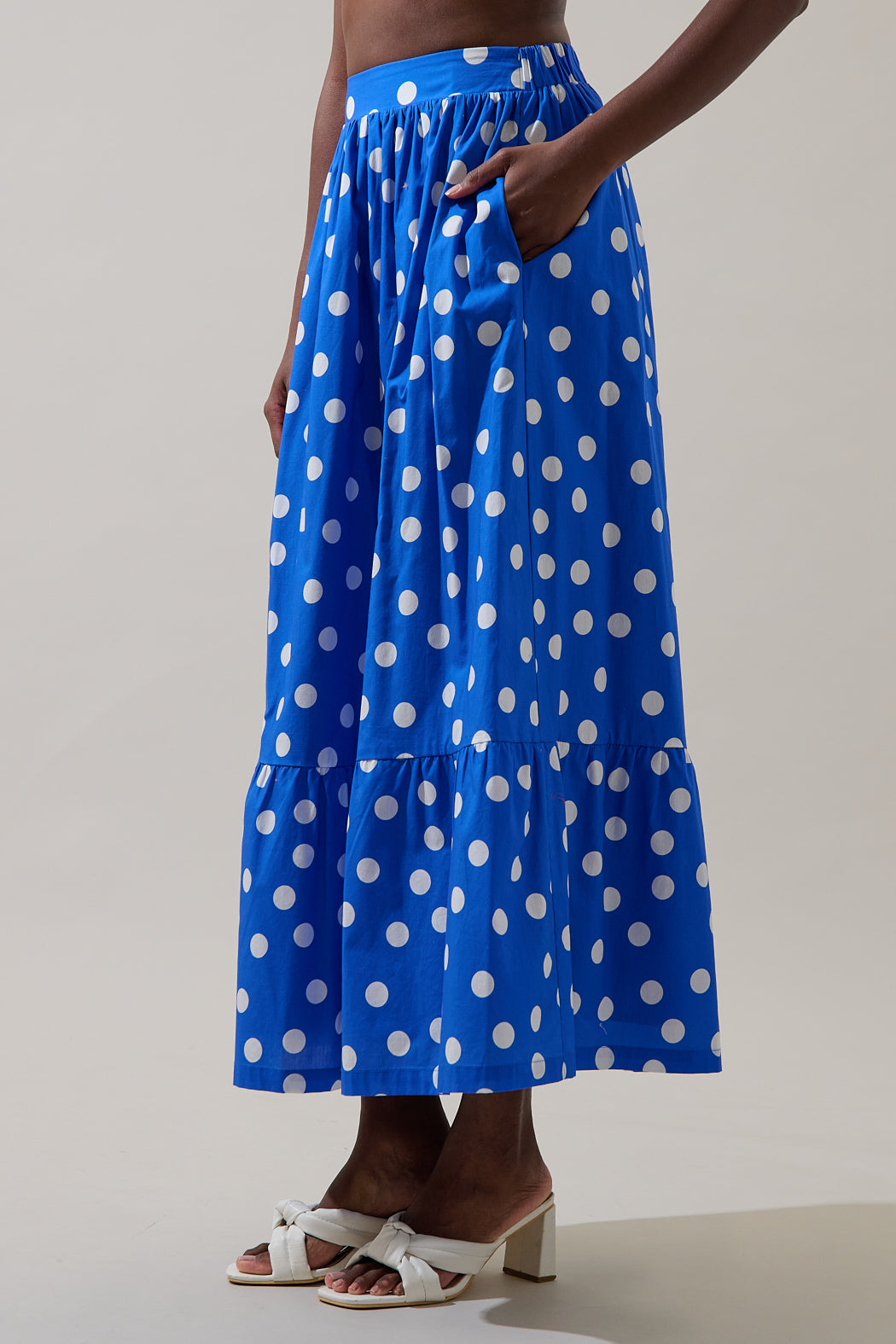 Step into a world of vibrant color and playful charm with this stunning polka dot maxi skirt. The bold, contrasting pattern and flowing A-line silhouette creates a cheerful look. Featuring a comfortable, fitted waistband and a flirty ruffled hemline. Pair it with the matching top for a full look.