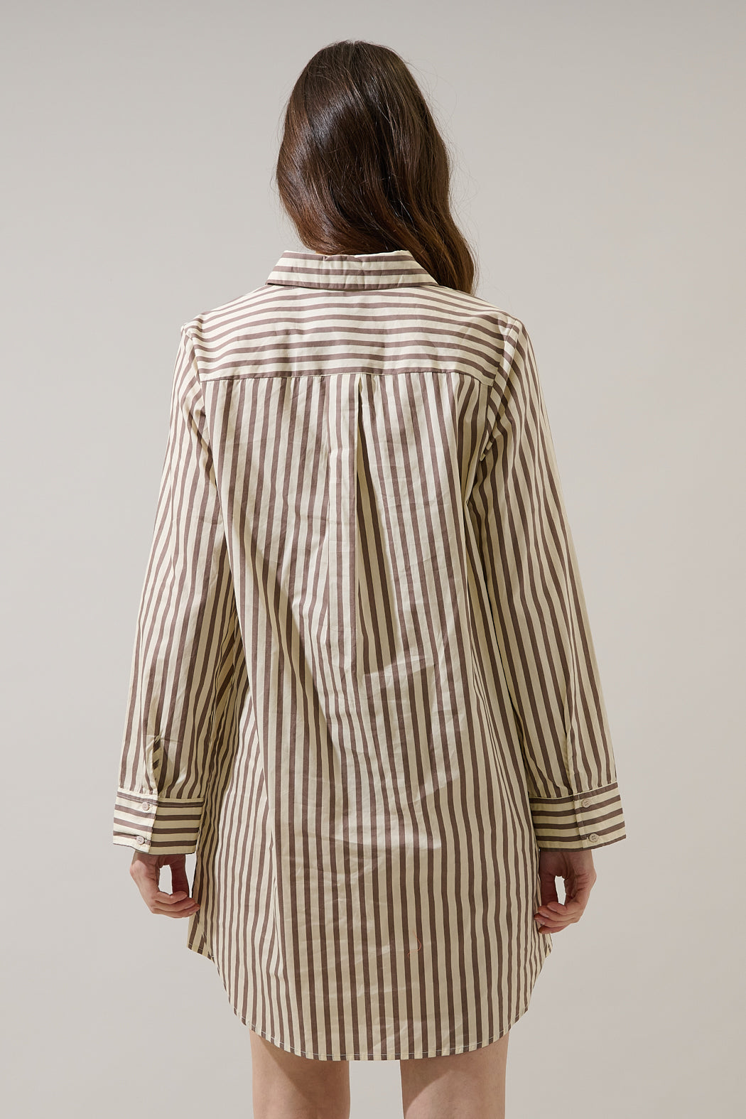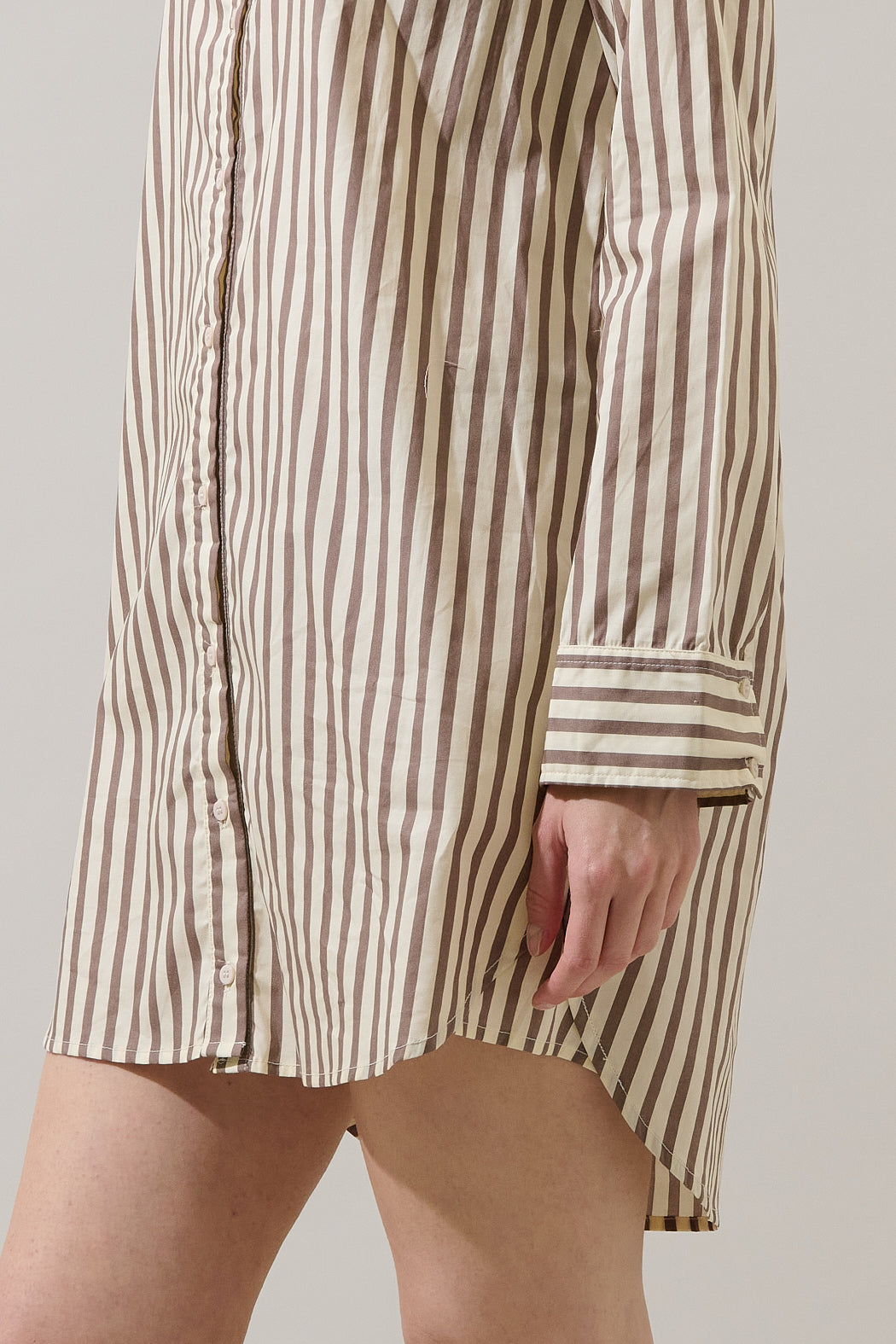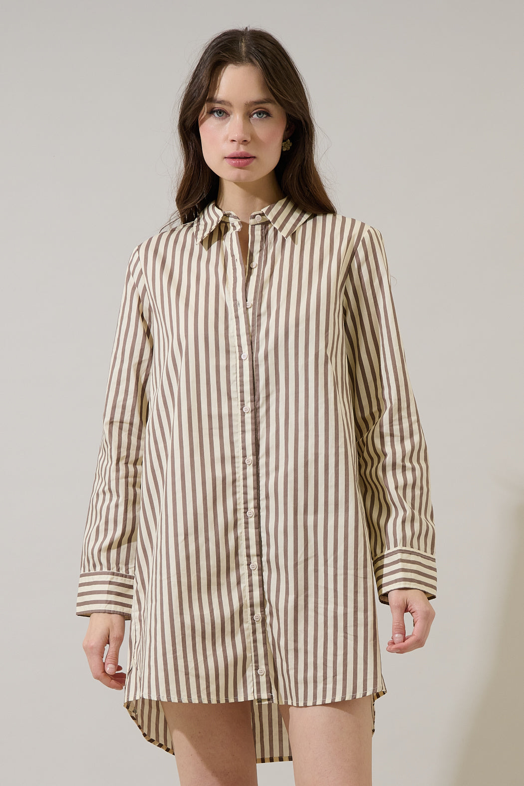 Look picture perfect every time you wear this striped mini dress. It has a collared neckline and long sleeves. The shift silhouette has a functional button placket down the center and ends at a mini hem. It can be easily be paired up with some with sneakers or heels!