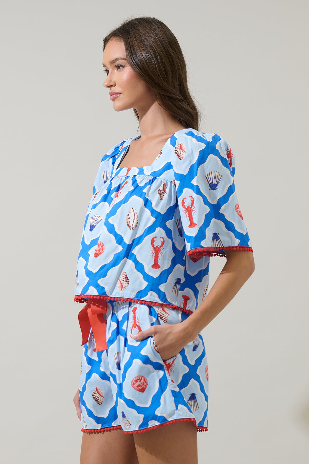 Coastal charm, all in one set! This square-neck top with sweet half sleeves is covered in whimsical lobsters, seashells, and ocean blues. A fun detail is the playful pom-pom trim. Perfect on its own or paired with matching shorts.