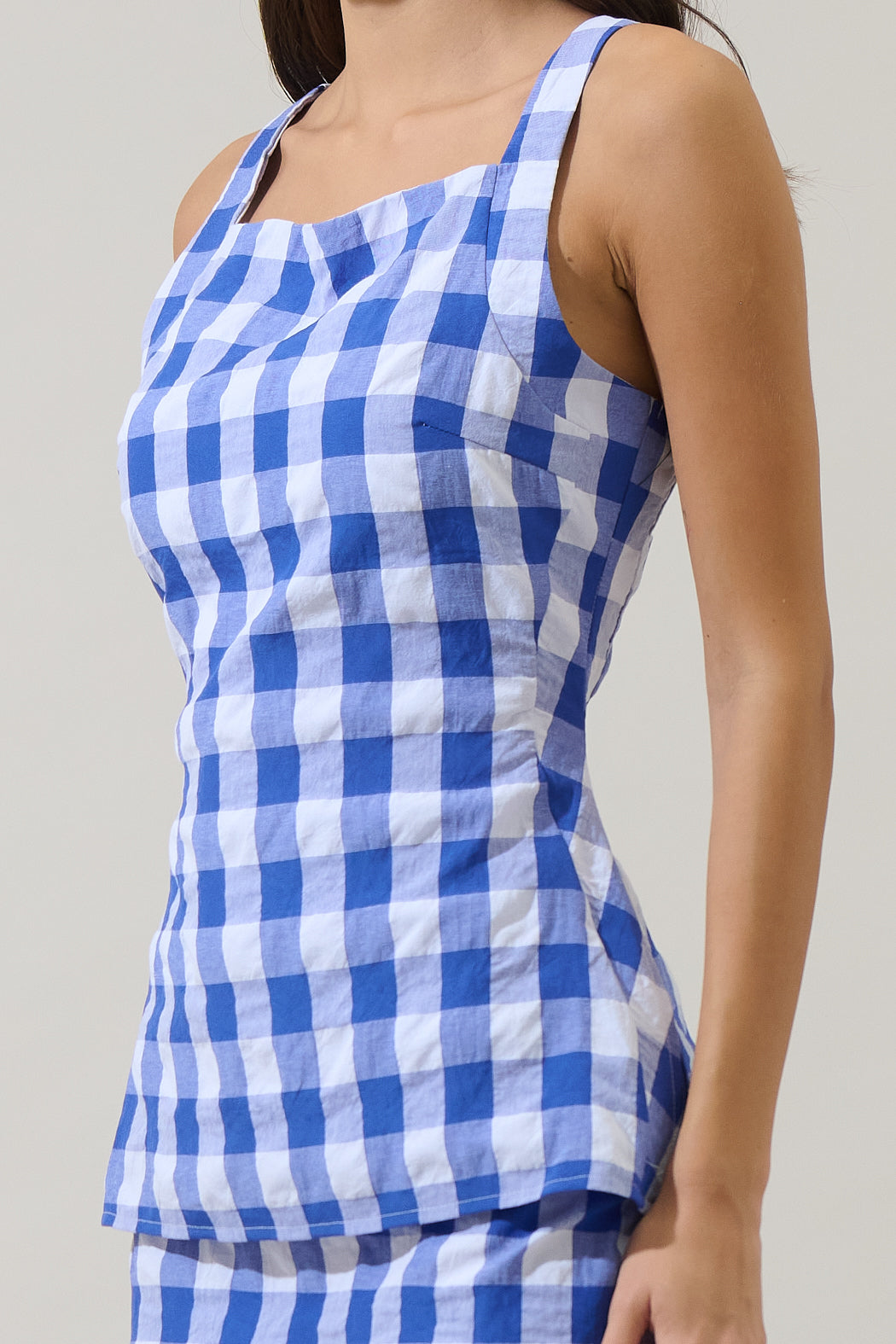 Capture the essence of summer with this charming top. It features a modern square neckline and wide, comfortable straps that lead into a tailored, elongated silhouette for a polished look. Pair it with the matching skirt and heels for a polished look.