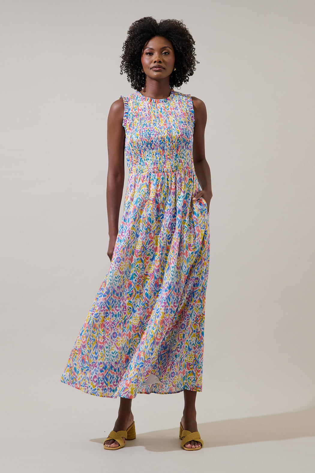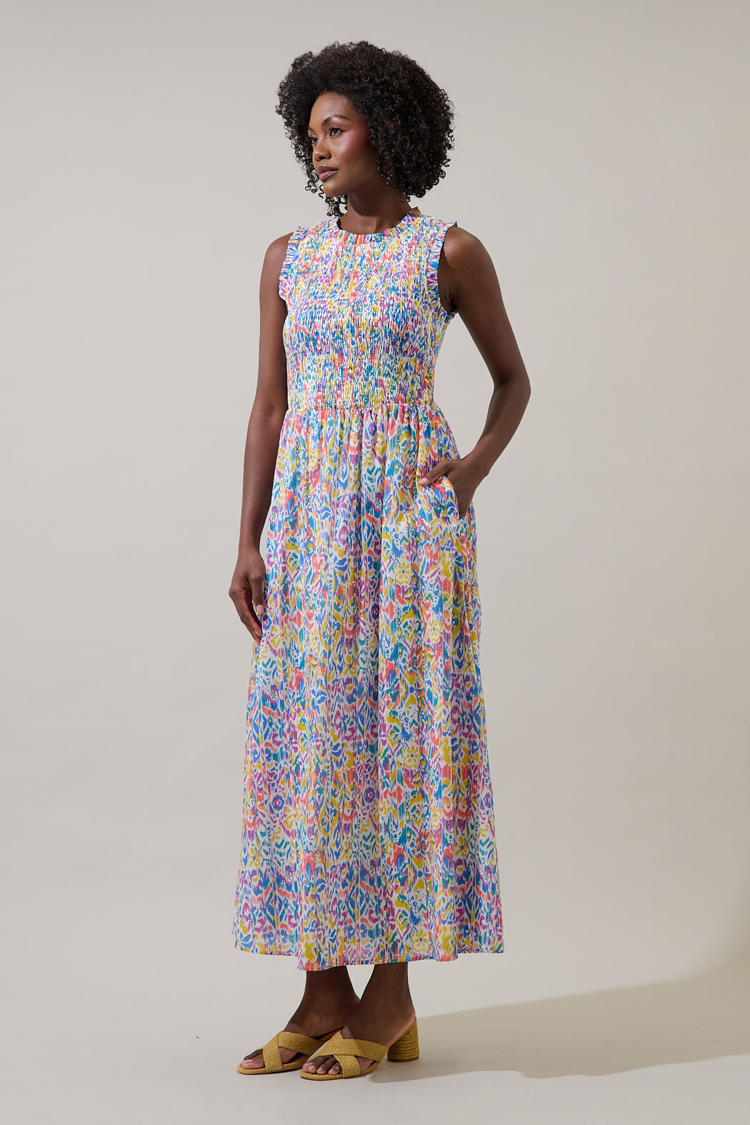 Malva Abstract Cecil Smocked Sleeveless Midi Dress