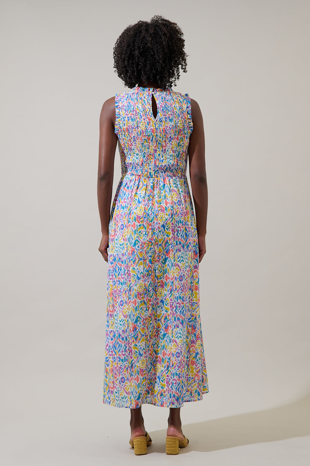 This instant wardrobe fave is bound to collect plenty of compliments through the spring and summer seasons. This relaxed maxi features a smocked and a sleeveless bodice. The back has a keyhole button. Easy to pair with any heels or shoes of your choice.