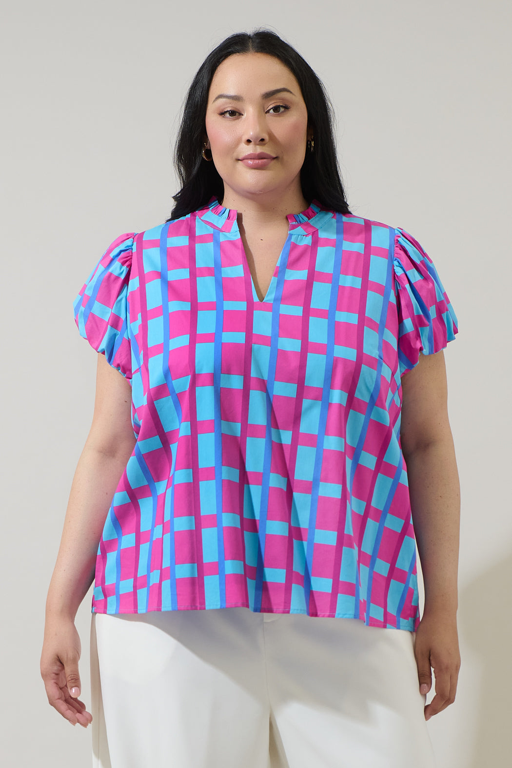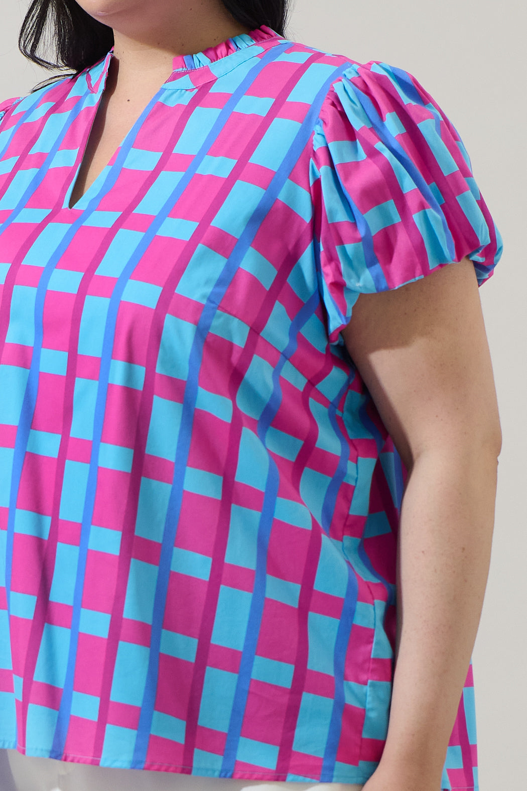 Brighten your day with this pink and blue checker top! It features a charming split neckline and playful puff short sleeves. Its relaxed fit makes it perfect for pairing with jeans, skirts, or shorts.