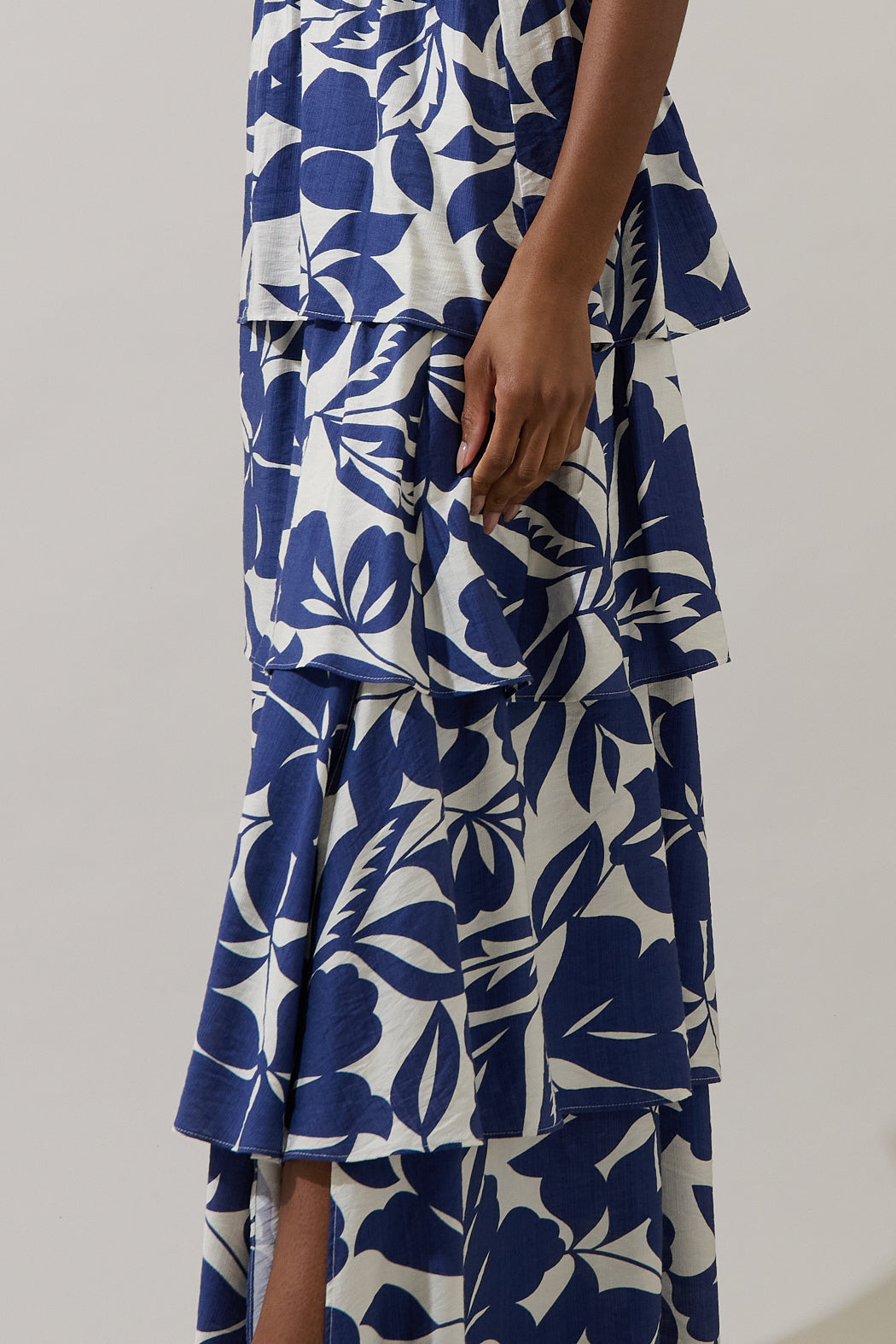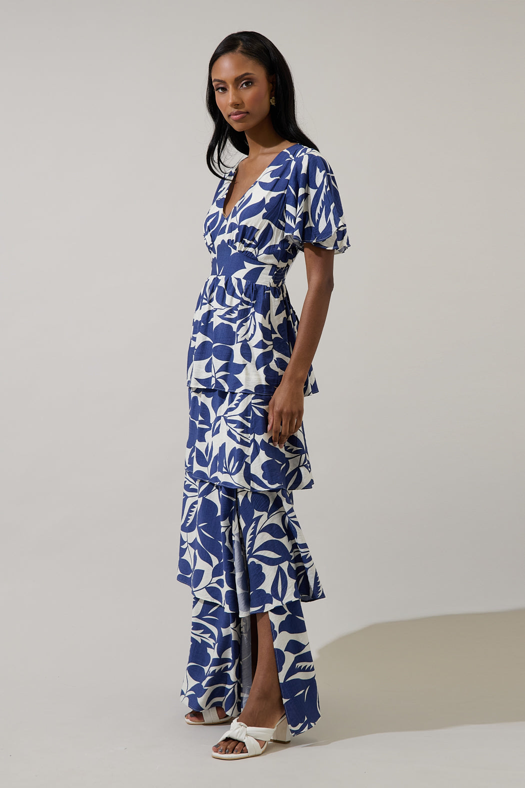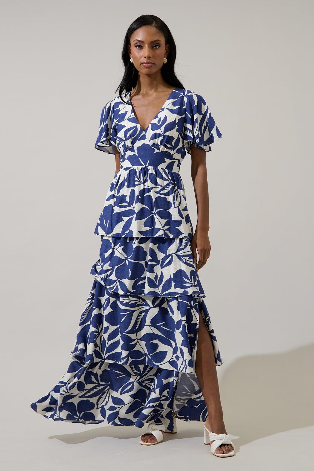 Graceful, flowy, and endlessly feminine. This floral-patterned maxi features a deep v-neck, short sleeves, and a tiered design with a smocked back for a flattering silhouette. Style it with any heels and a delicate clutch for a polished finish.