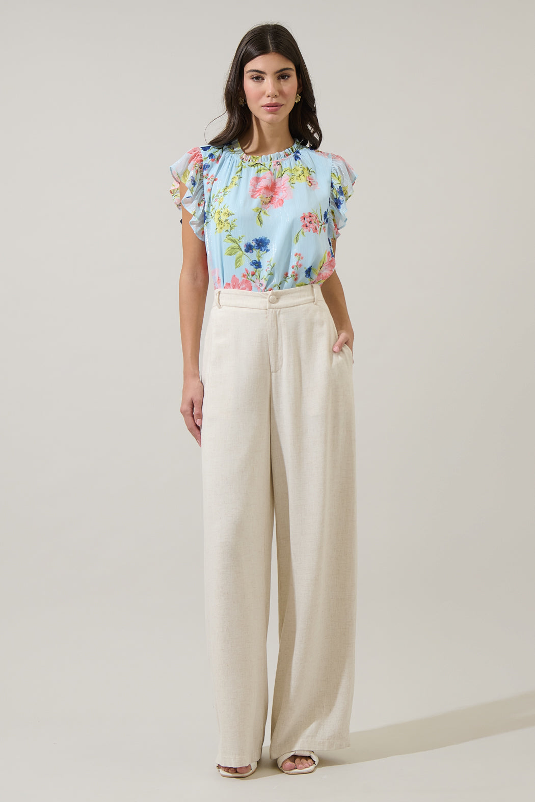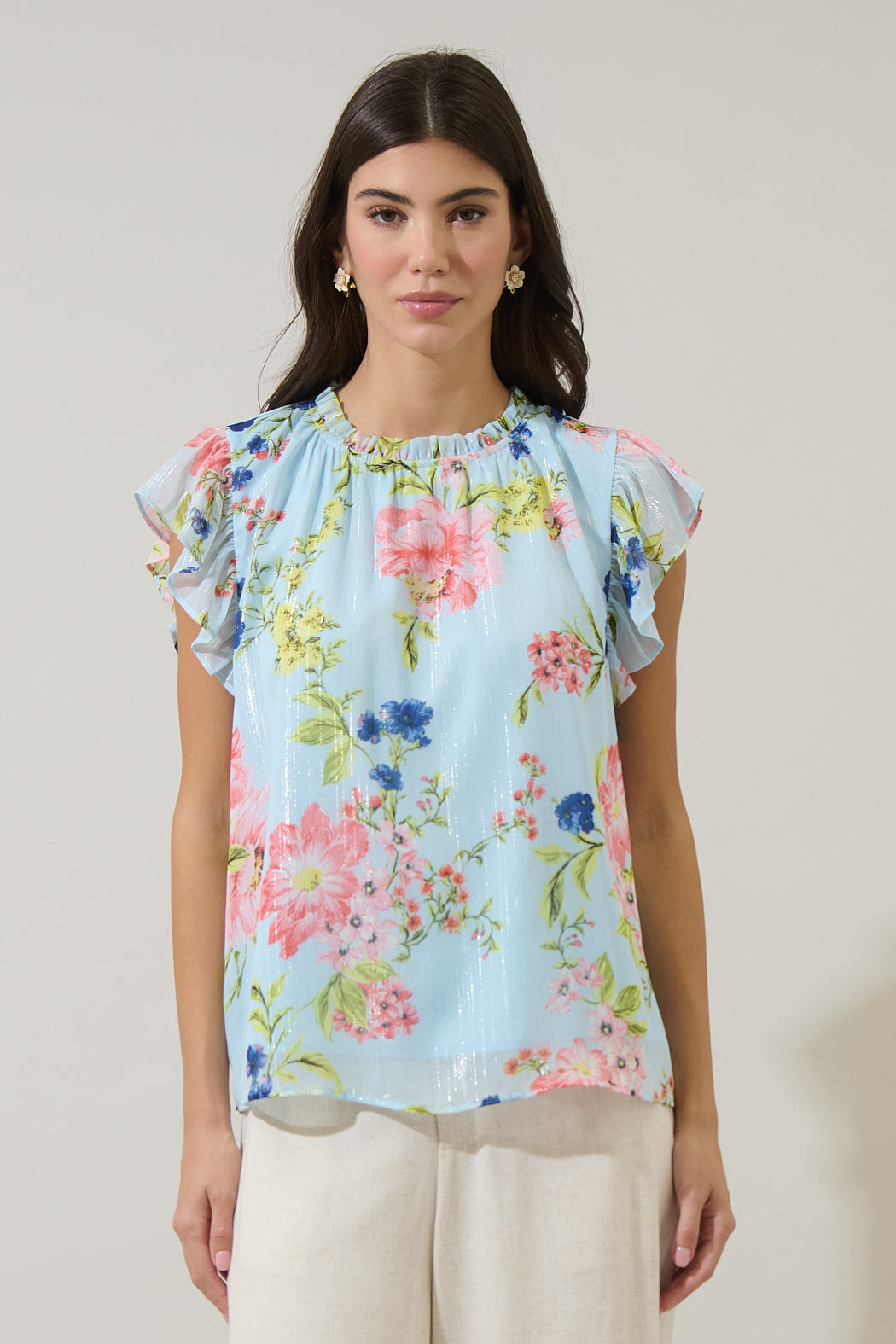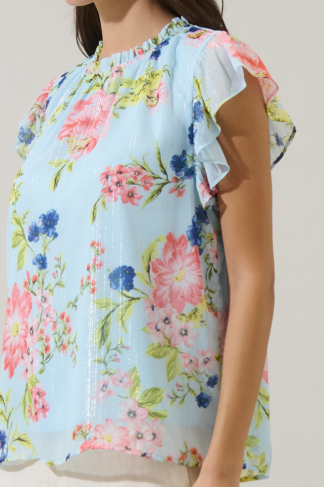 Meet the Missa Floral Veda Cap Sleeve Top. It features a ruffle trim neckline. The bodice maintains a classic straight fit that's framed by flutter cap sleeves. Wear it tucked into your favorite high waisted pants or keep it as is.
