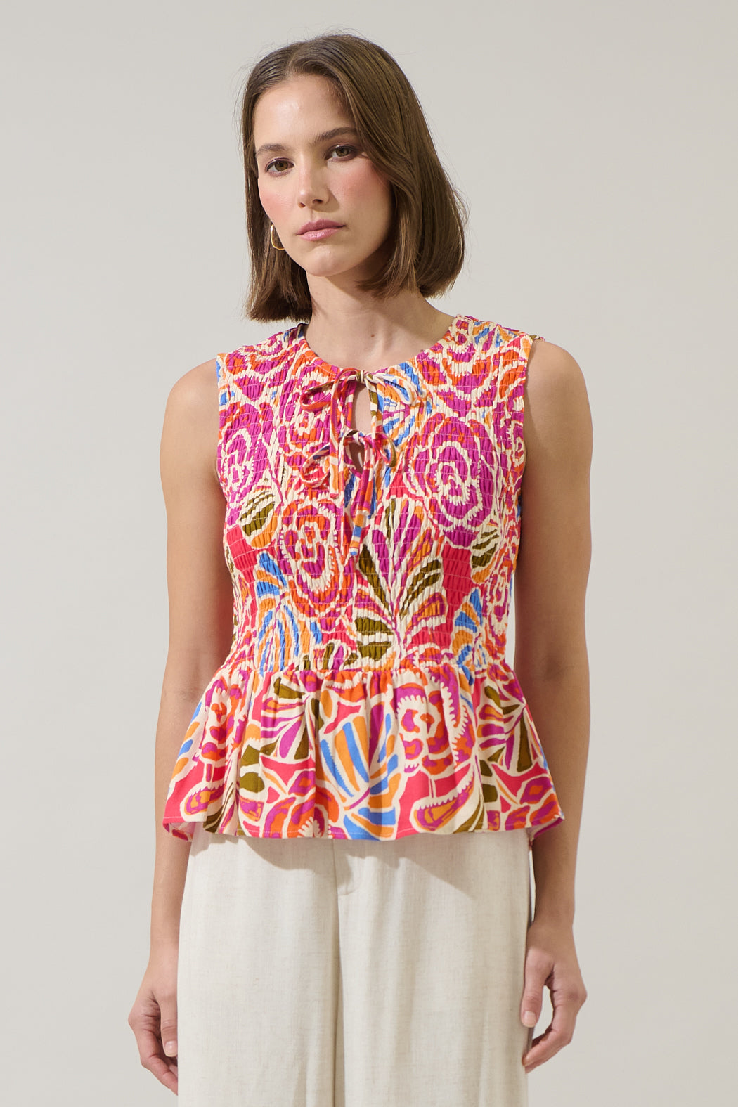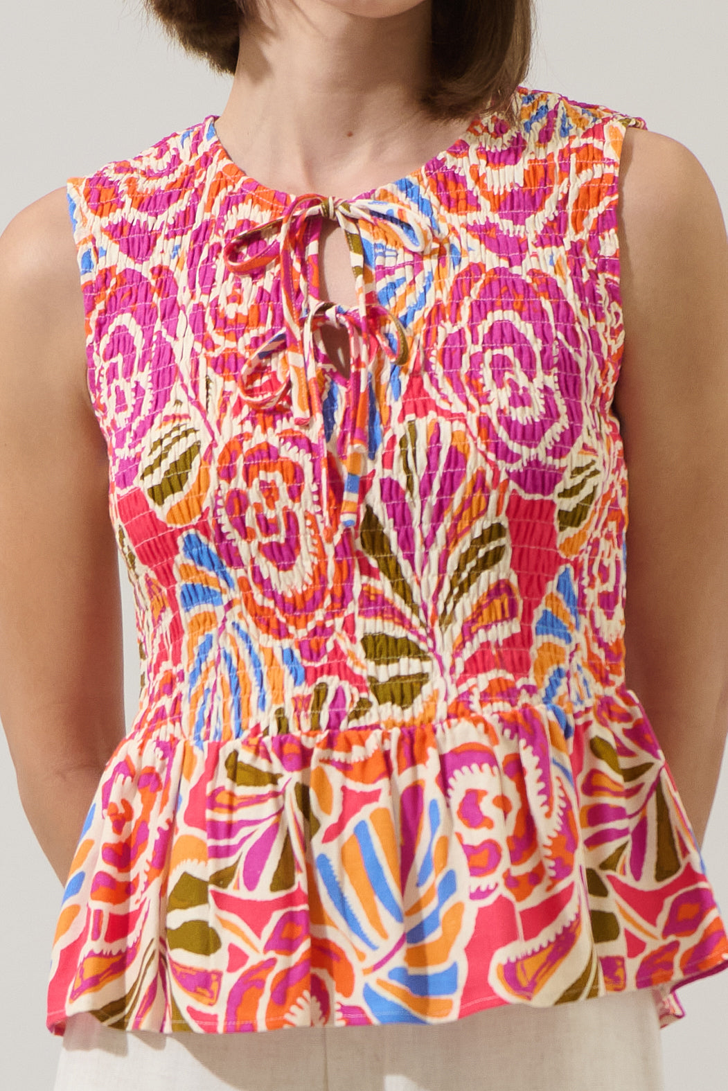 Brighten your wardrobe with this cute top, featuring a playful mix of pink and orange florals. The smocked bodice offers a comfortable, fitted silhouette, while the peplum hem adds a flirty, feminine flair. Perfect for pairing with jeans, skirts, or shorts for a sunny, effortless look.